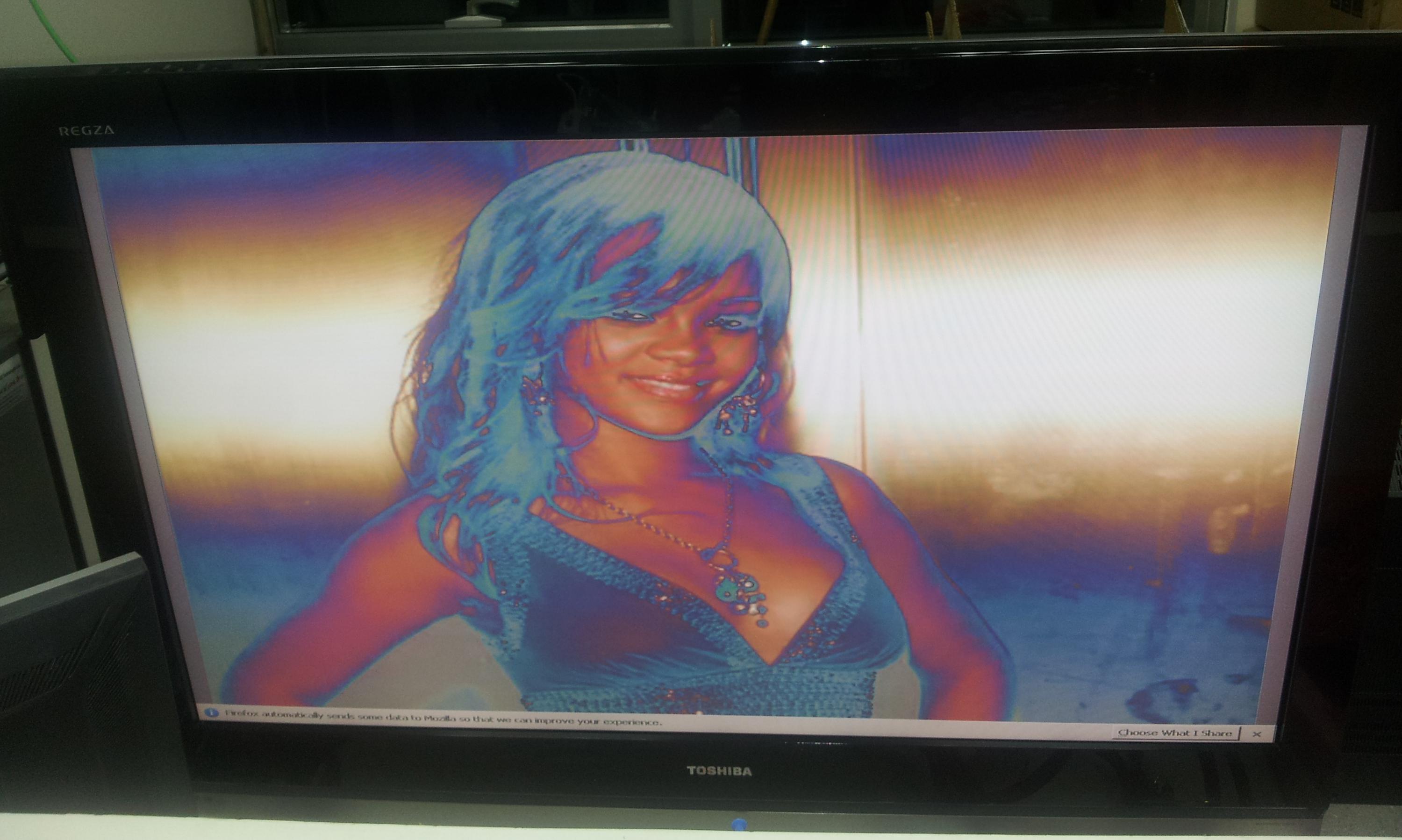 Tried the A/V , Scart , VGA inputs so far - they all show the same distorted colors.