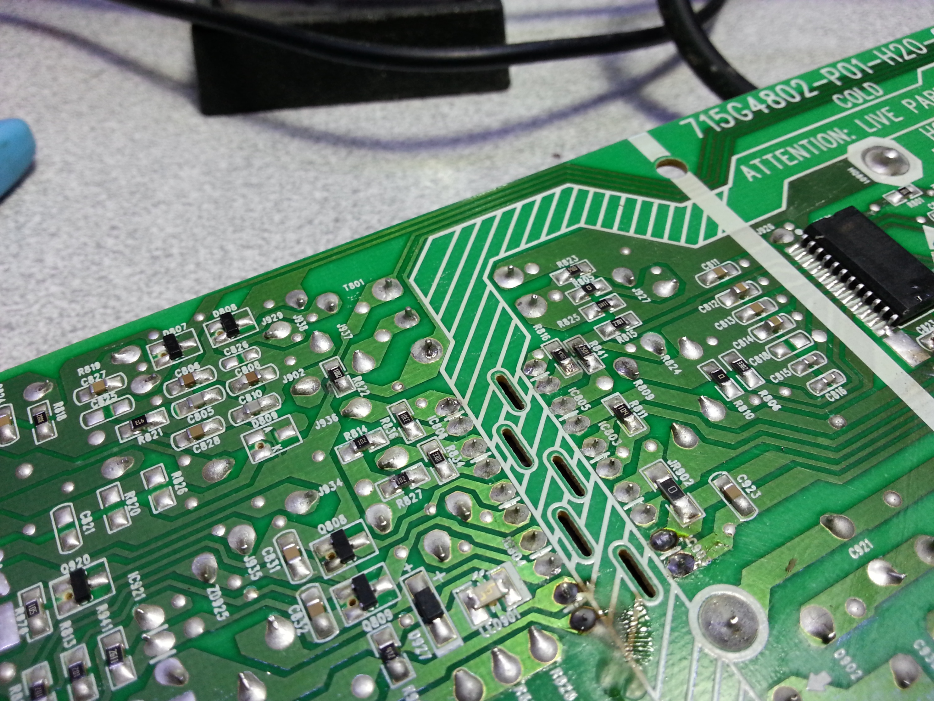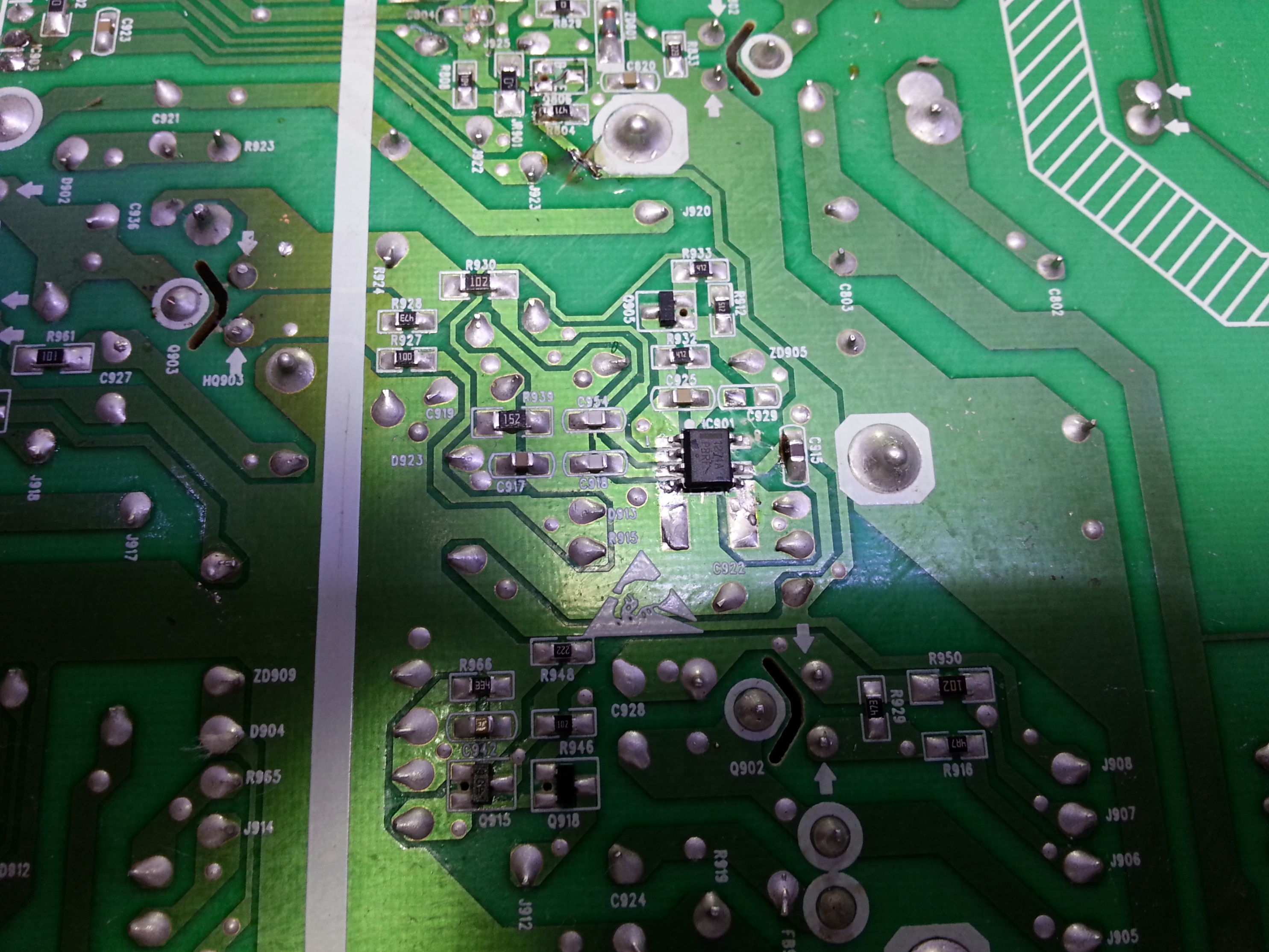 TV working without backlight. Examined the 24pin IC of the backlight and found many shorts. Found also some traces of possible arc-ing between smd components (last pic).