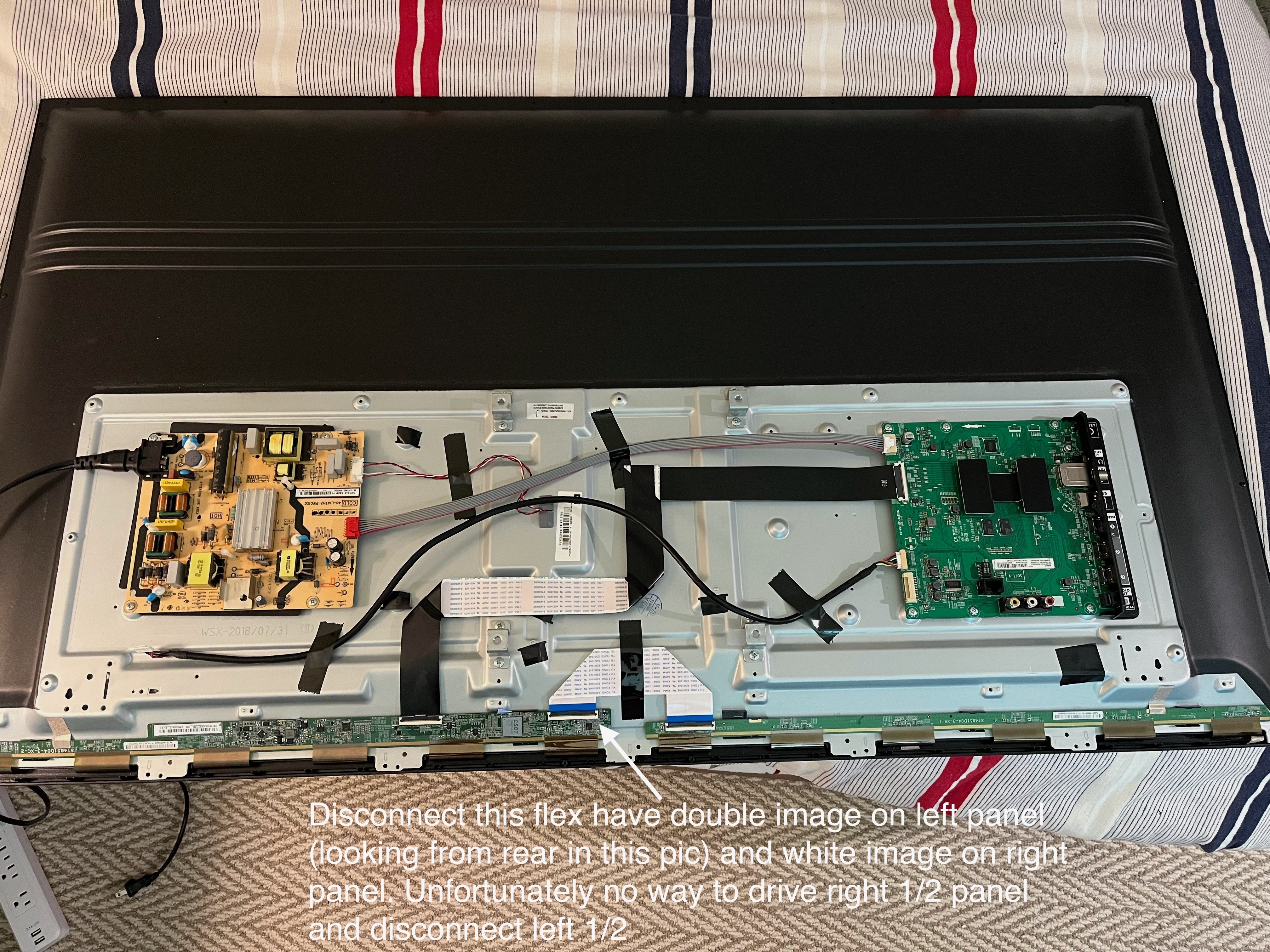 This one looks to be a more difficult to diagnose because most? of TCON seems integrated ( CSOT BGA on buffer baord) into the left panel edge board ( looking from rear of TV) There are 2 buffer boards for each 1/2 of the screen. Main connects to the left buffer board where TCON is, then flex connects left buffer board to the right board. Disconnecting the right board gets double image on the left half and white on the right half. Unfortunately, with TCON integration on the left buffer board, can't disconnect the left half of the panel while driving the right half.