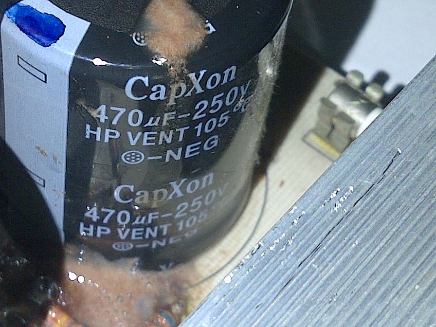 After quickly disconnecting mains, also noticed 1 of $ large caps had also oozed. There were no buzzing or popping sounds or any smells emitted.