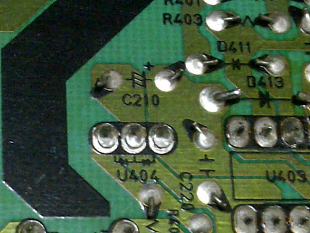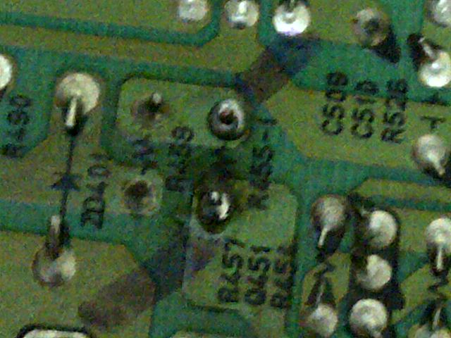Examination of the board showed a small area of discoloration and the resistor (R455-1) there was found to have come unsoldered. Re-soldering did not bring the unit back to life.