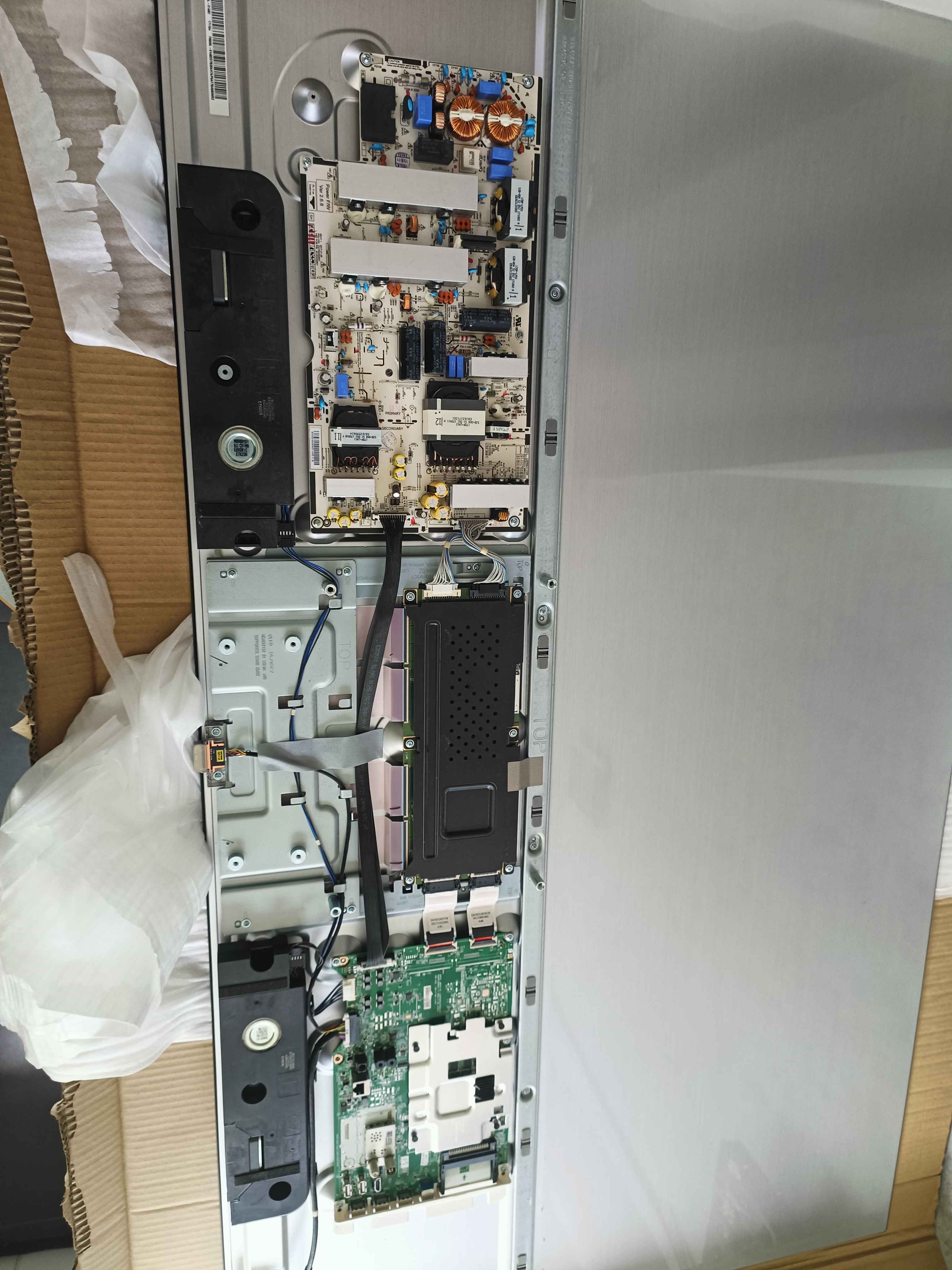 I don't know if it is the T-CON board or the power board that has failed and if it is the big transformer (in red) that has failed.