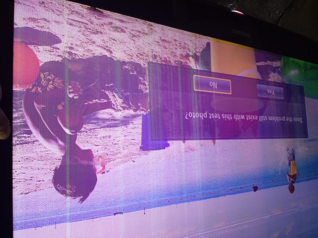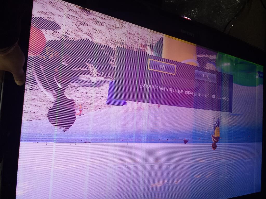I am working on 46" Samsung smart TV. The TV is having Horizontal line all over the screen and shows weird colors as well. The color issue gets worse after 2 minutes turning the TV on. I have checked the voltages at the power-supply all looks normal. No visual damage. The voltages at the T-Con voltage regulaters looks normal as well.. any suggestions. photos attached.
