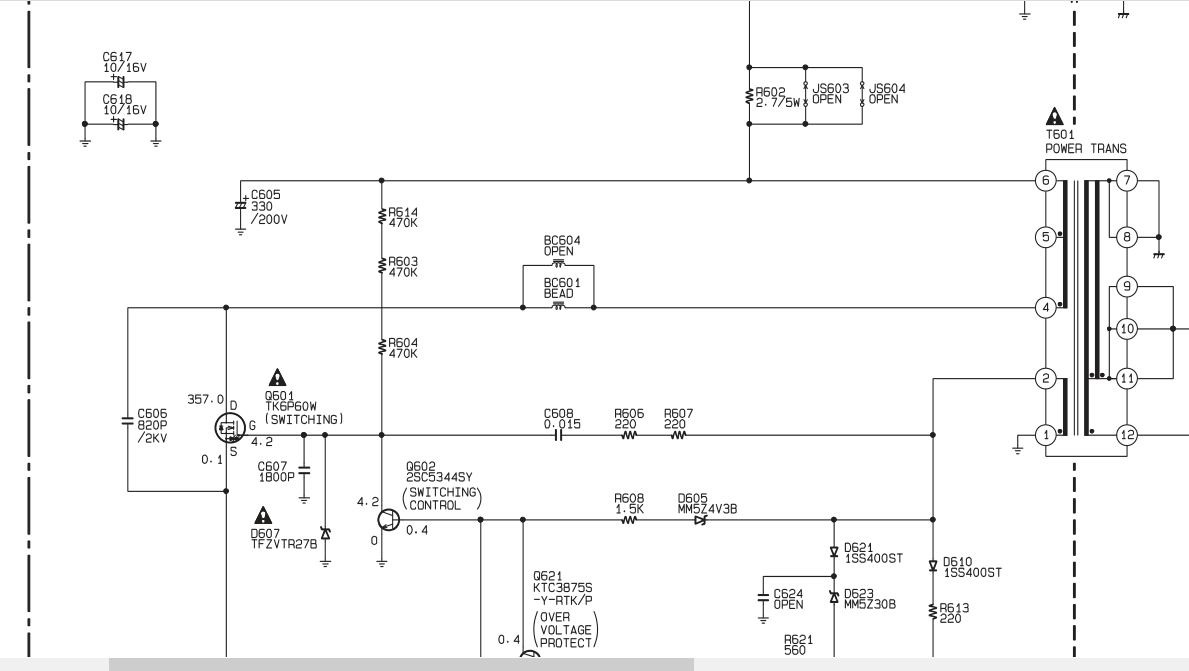 The same 32" Philips TV I was having video issues, but now I don't have standby led at all. Someone here shared with me the schematic of the power supply, and checking the voltages, I see right after the resistor R604 I'm getting 1.6 v which is too low for enabling the Gate of the Q601 mosfet (the diagram says 4.2). On the R614 resistor I'm getting 181 V in and 117 V out, then through R603 I'm getting the same 117 V in and 59.9 V out, finally getting the latter voltage in the R604 BUT getting just 1.6 V out, which is the voltage that goes on to the Gate of the Q601 mosfet I mentioned. Any clues on why I'm not getting the stand by led? Because the mosfet is not switching on and off, there's no standby or secondary voltages.