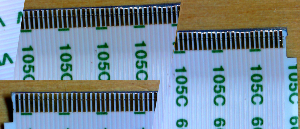 Being fairly confident now that it was likely just open joints and I could maybe get by without ordering a board, I went back in with a vengeance and screwed up a bunch of stuff in a hurry to get it back up and running. I fluxed again, but this time, went across the pins with a chisel tip iron and a bit of fresh solder, which spread all over everything (as expected). I figured to soak up most of it with braid and clean the ribbons more thoroughly. Long story short, my Opti-Visor magnification wasn't up to the task, and I was too sloppy, and didn't spend enough time checking my work. It powered up to a backlit black screen and gently touching the ribbons did zilch. Turns out, not only had the braid left a bunch of pins bridged that I could have easily seen, but the edge lines on two of the ribbons had lifted from the substrate and were all crossed up and smashed (probably from the alcohol & brush). I figured I'd powered up with a bunch of shorts, and may have killed the T-con, so I went ahead and ordered a replacement for $25+10. The ribbons were looking really difficult to repair, so against most advice I saw online, I attempted to slice off about a millimeter of the end of the two bad ones and check them thoroughly with a USB microscope. I also had to slice the little index tabs from the sides and take extra caution to see that they went in straight.