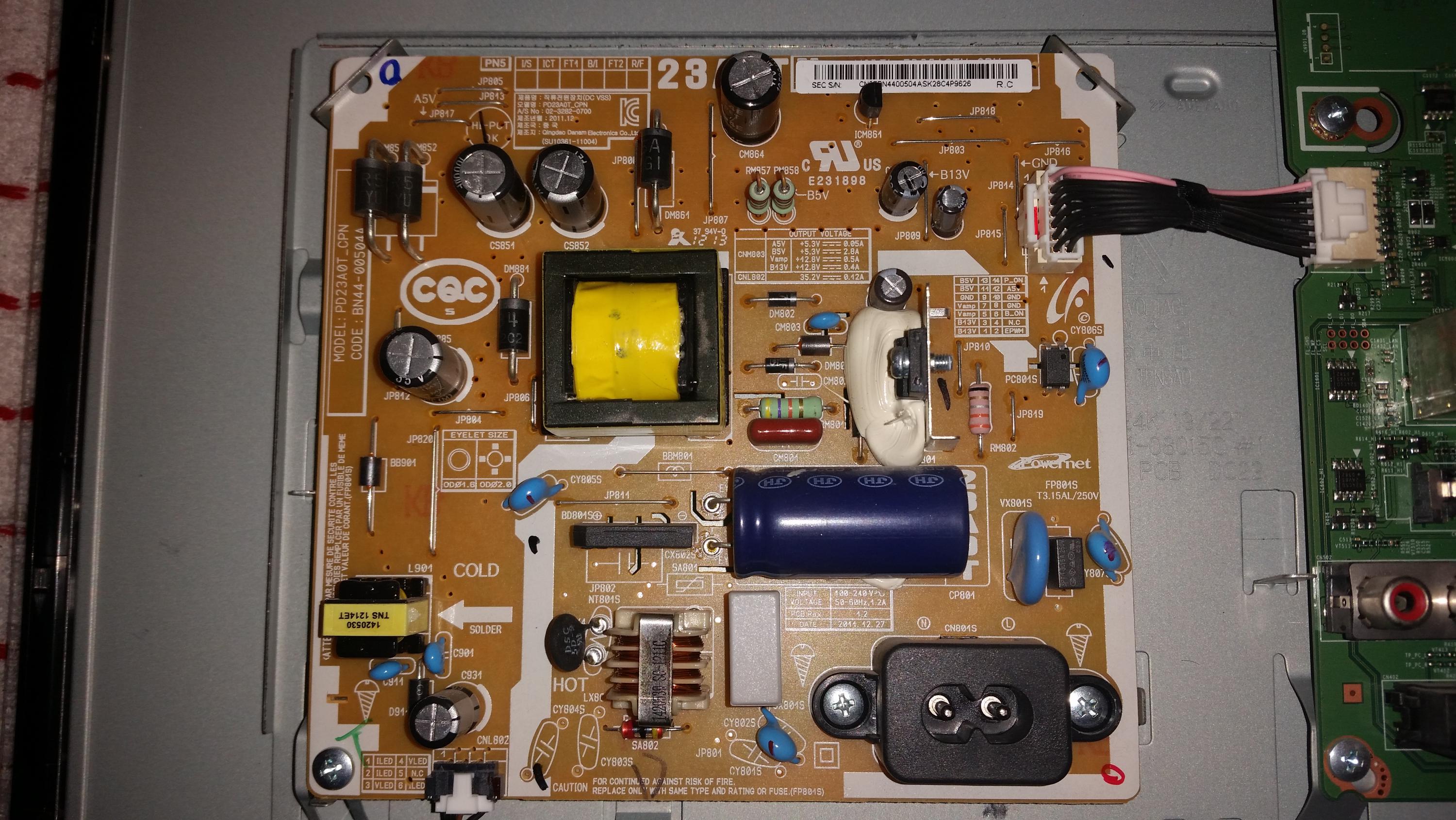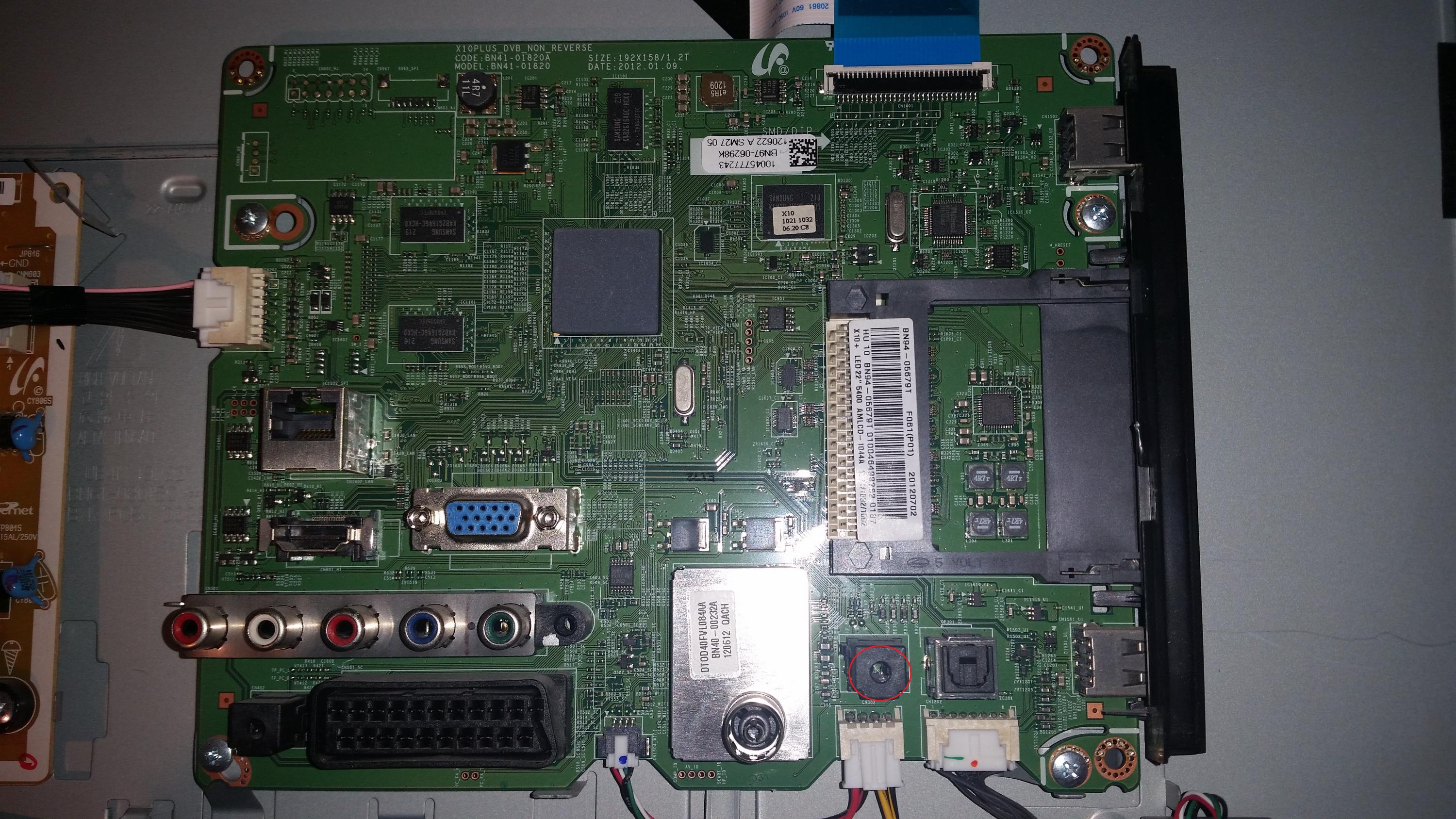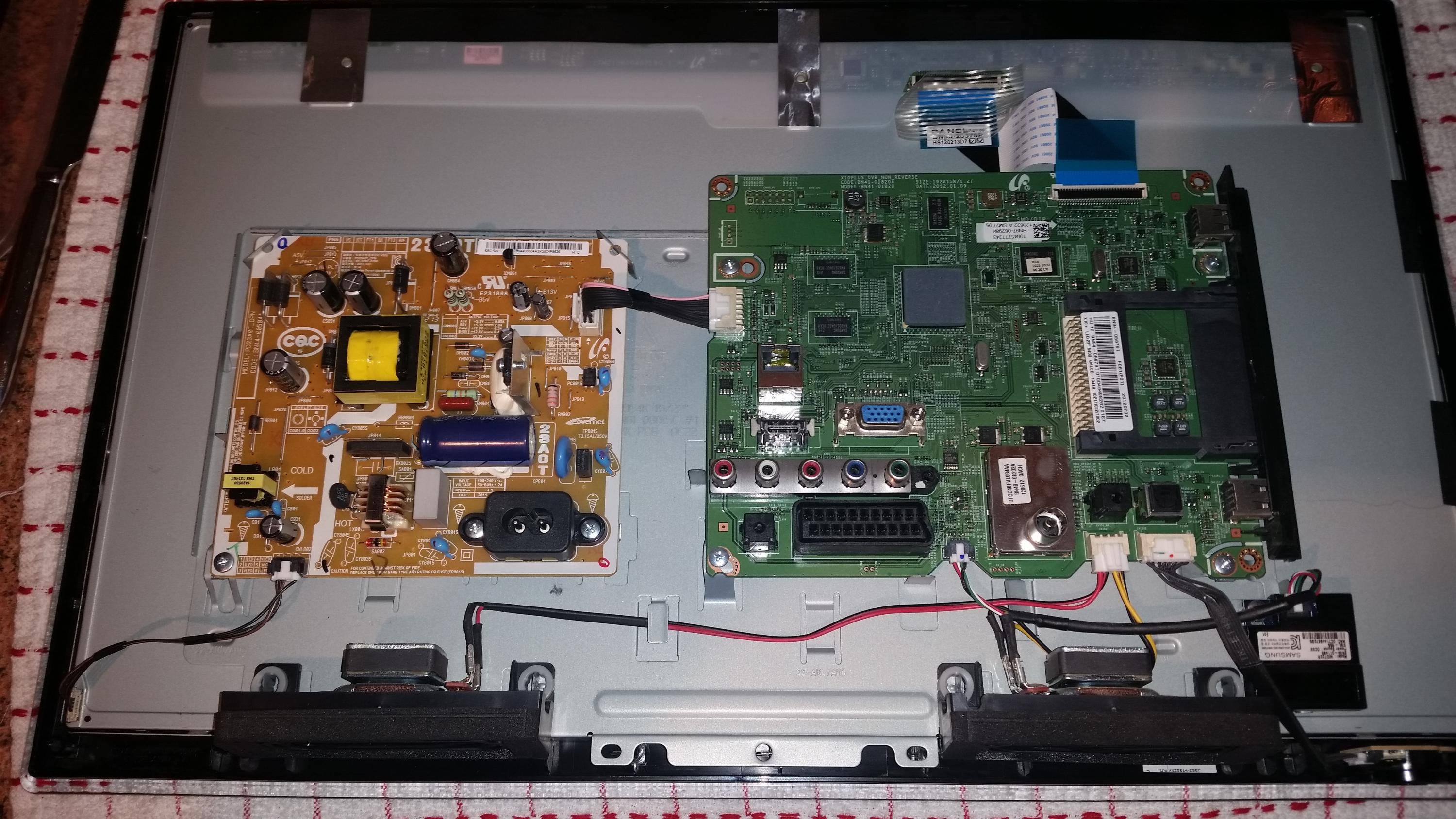 Probably a bad audio amplifier IC. I doubt a schematic for E-series (2012) Samsung will be available.