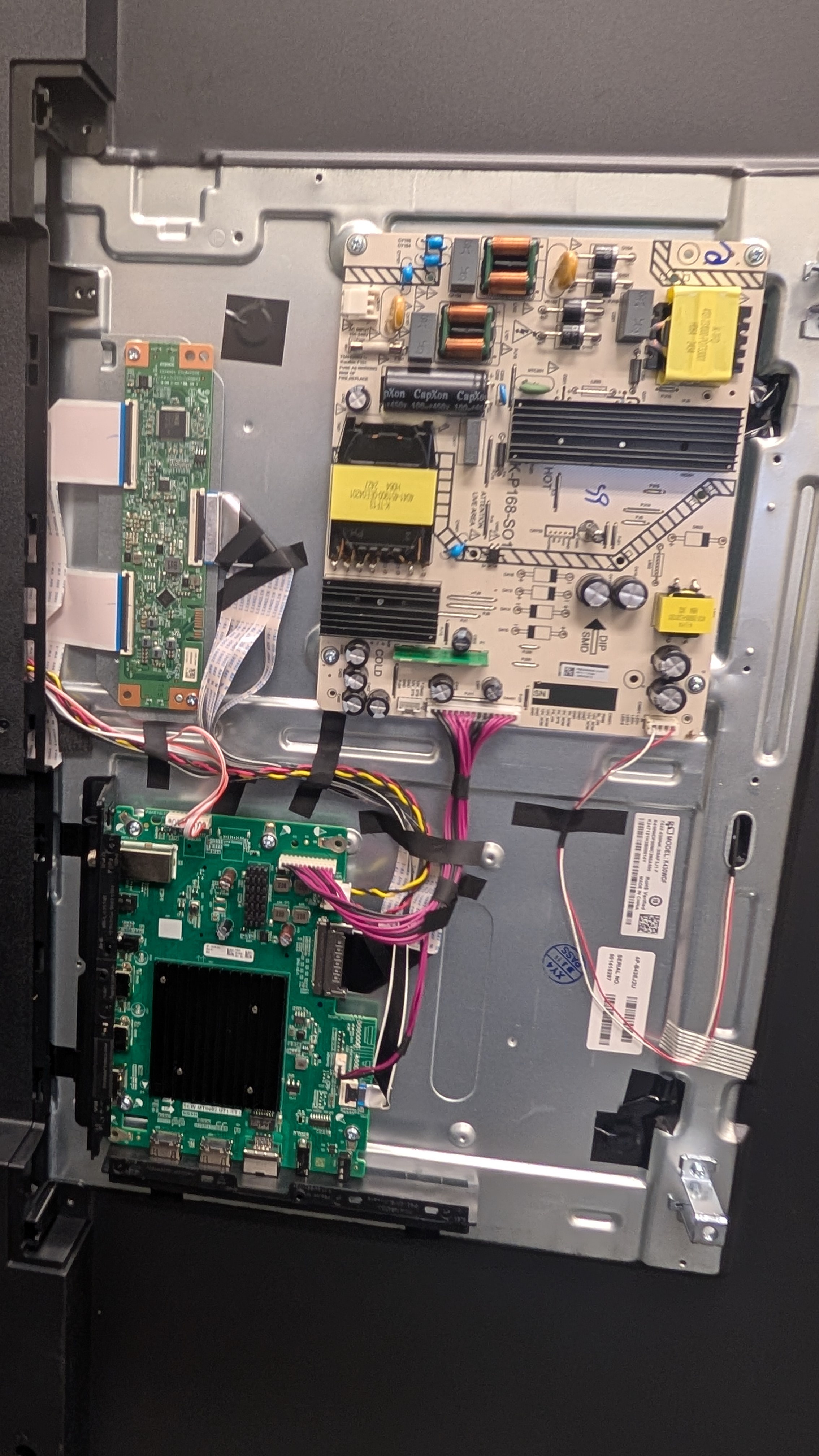Sharp TV/Display, wont turn on. Brand new, used for maybe 30 minutes. Possibly heard pop then set went dead. I took a look at the boards, no visual damage to boards. The led power indicator is ON, remote will not turn on. I verified that backlights do come on when powered with separate power supply/LED tester. I also