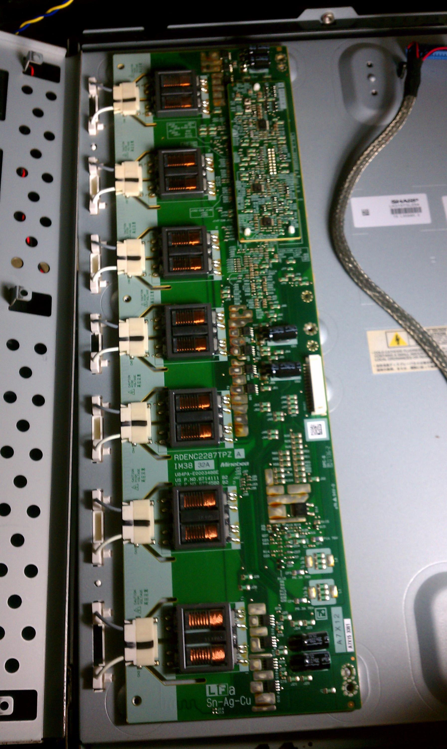 Armed with a lot of space and patience, I decided to open the TV, immediately noticing that a LED had flamed out and also burned a portion of that reflective white panel behind the transparent LED diffusers.