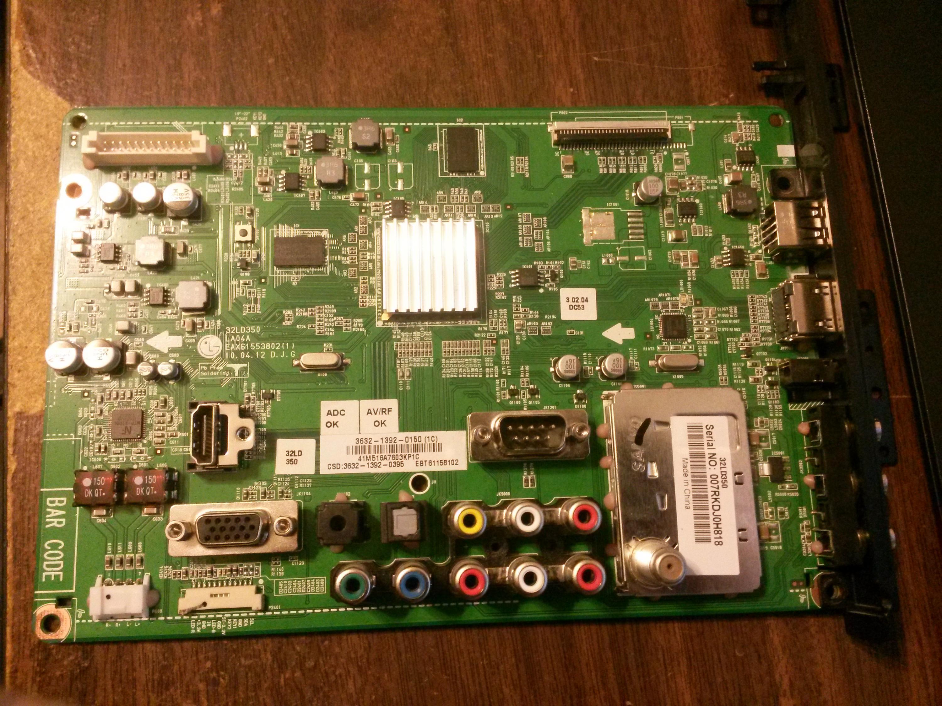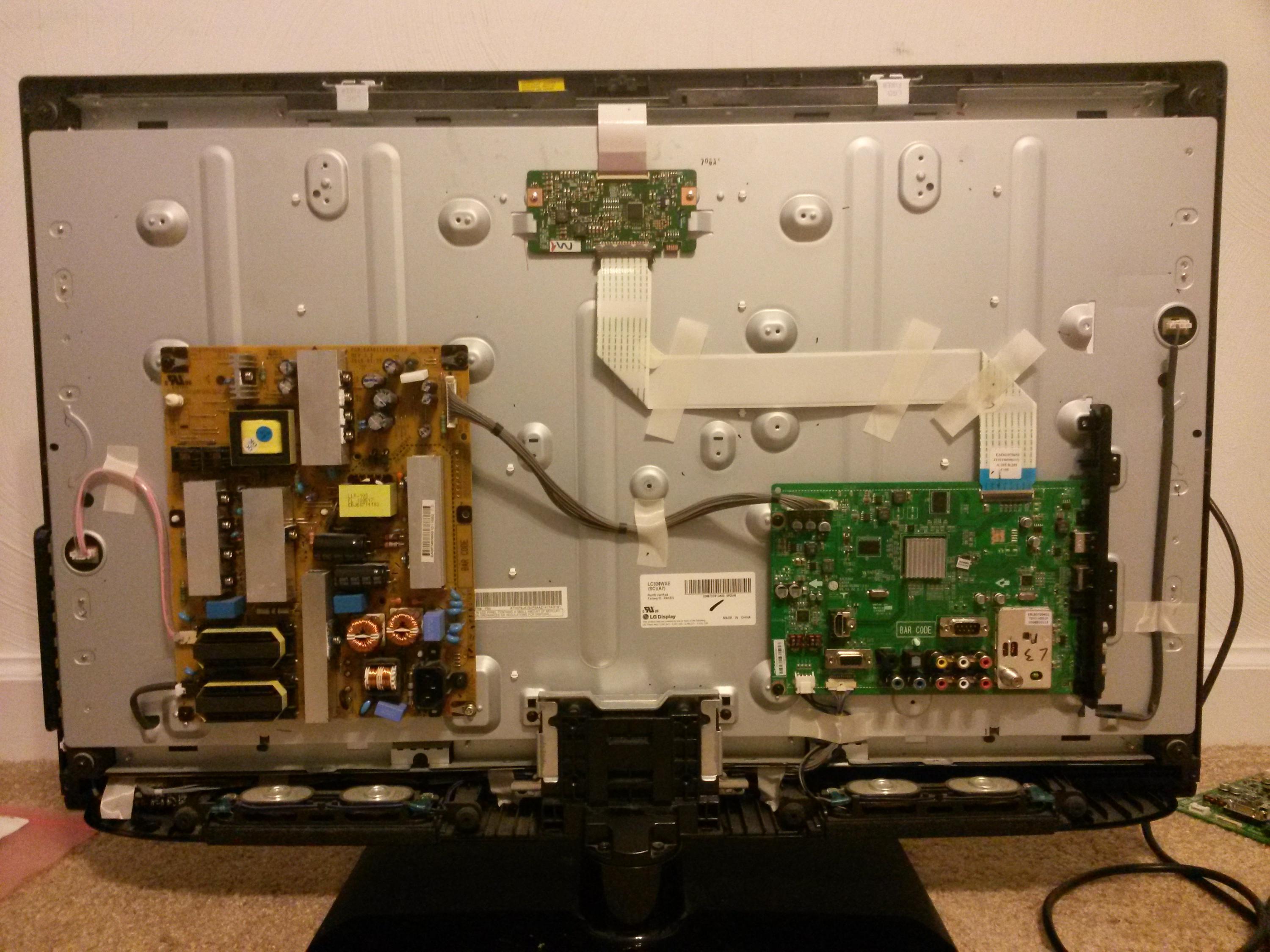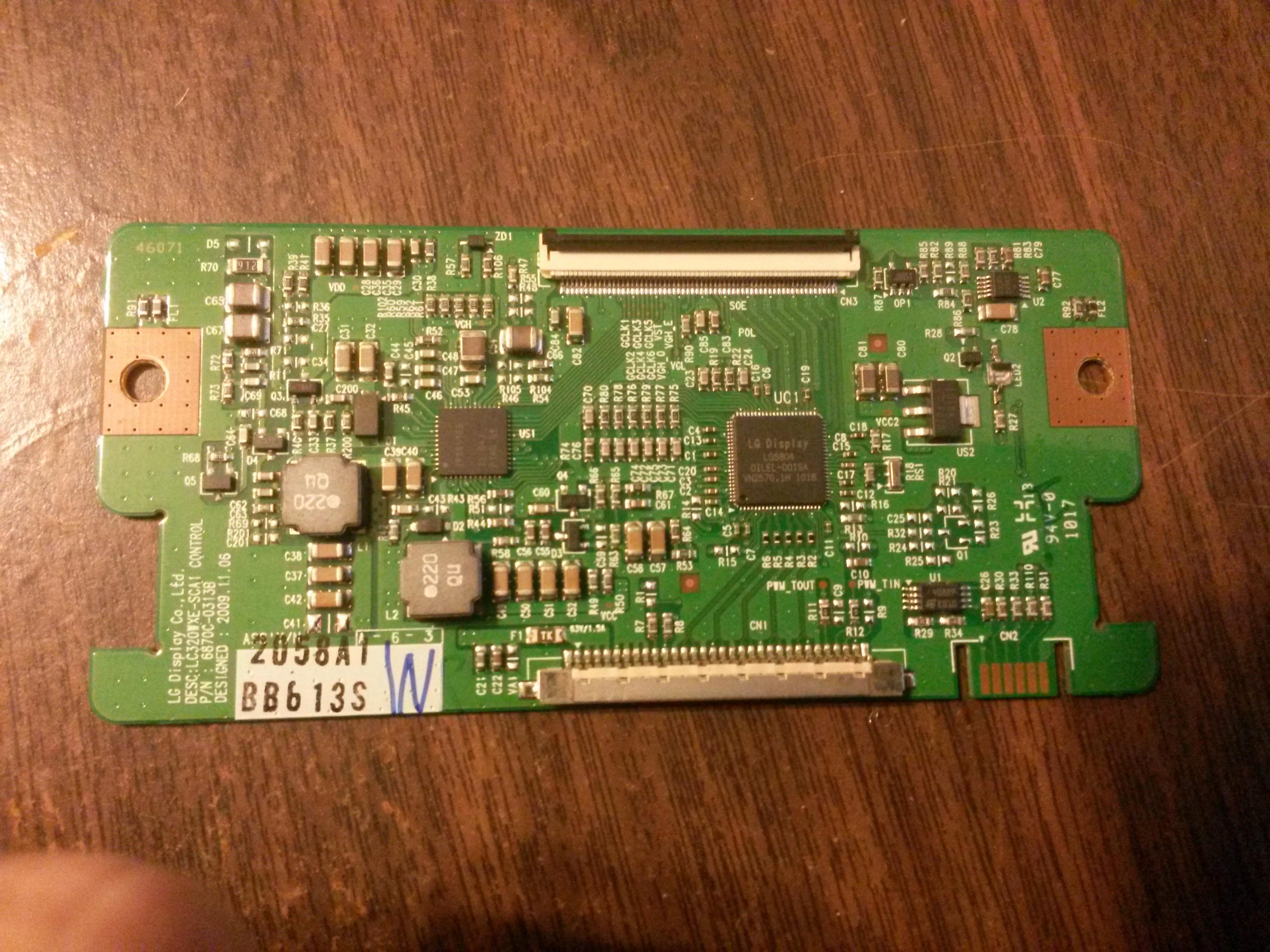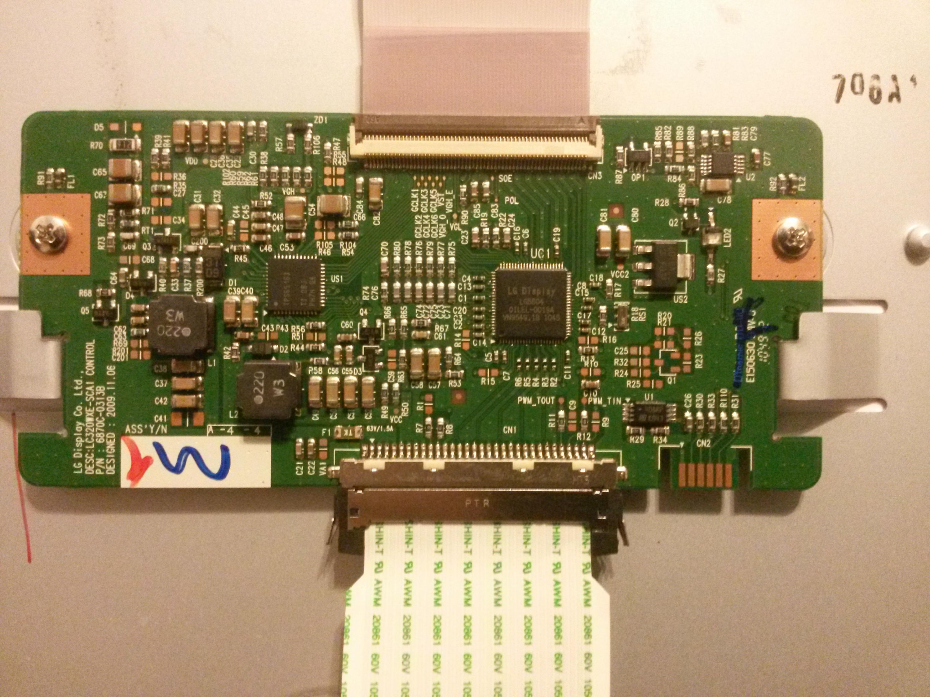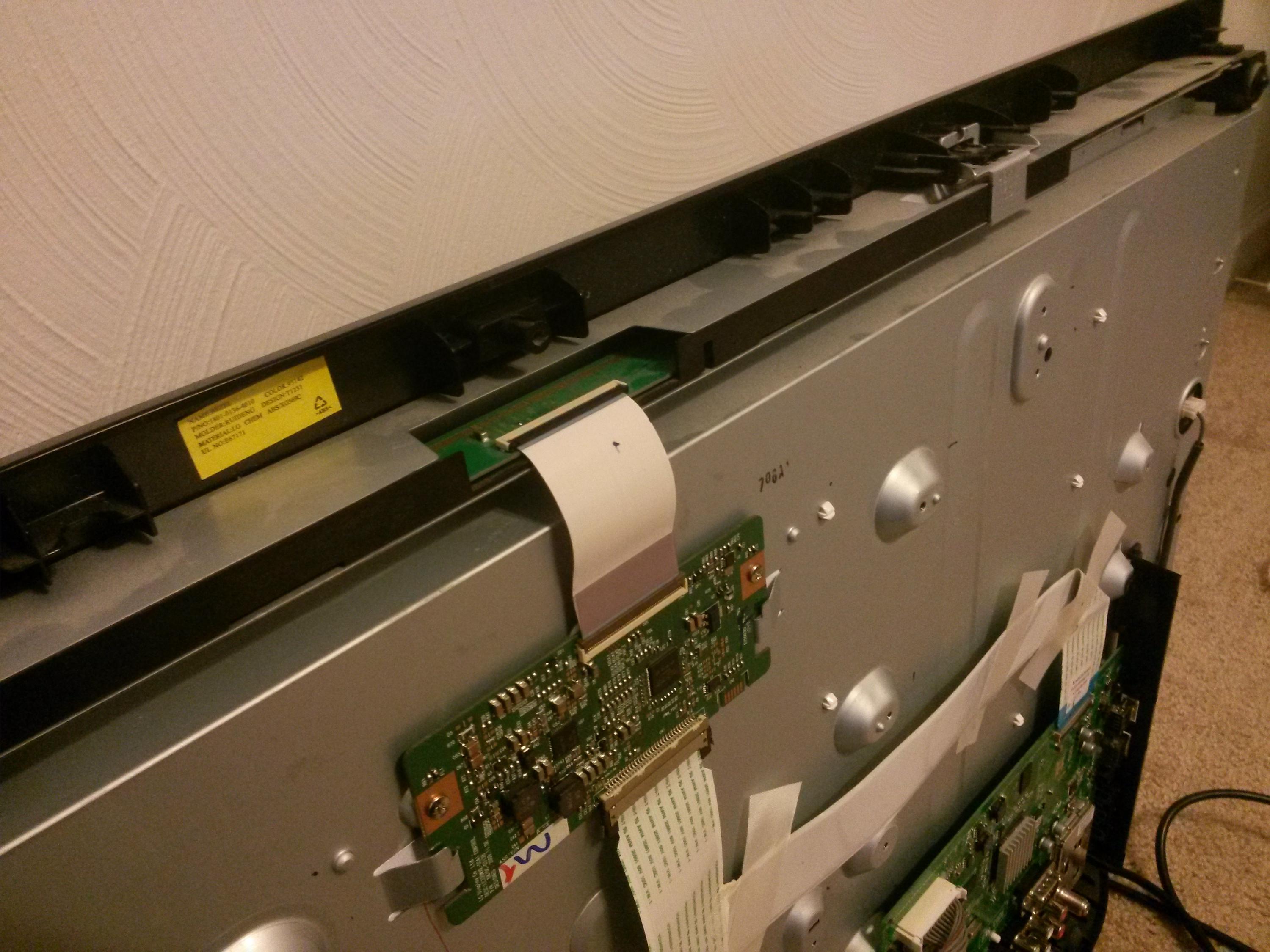 I got this TV for free after it had died during an electrical storm. I don't have all the details but lots of people in the neighborhood had their TVs and other electronics die at the same time. When I first got it it would not turn on at all. I tried replacing the power board which made no difference. I then replaced the main board and the TV came to life, albeit without any video on the screen. The audio works fine, backlight comes on, buttons work, but there is nothing on the screen, not even menus. I assumed the culprit was the T-CON board since it behaved exactly the same with it unplugged, but replacing the T-CON board made no difference. I have tried reseating all the relevant cables to no avail. I have checked the cables for continuity and not found anything wrong. I have checked D1, D2, and US2 on the T-CON board and they all show voltage (I forget the exact readings, two of them were 3.3 I believe). Also there is one other board at the top of the screen that I cannot identify or see how to remove. Any help, advice, or diagnostic suggestions would be most appreciated.