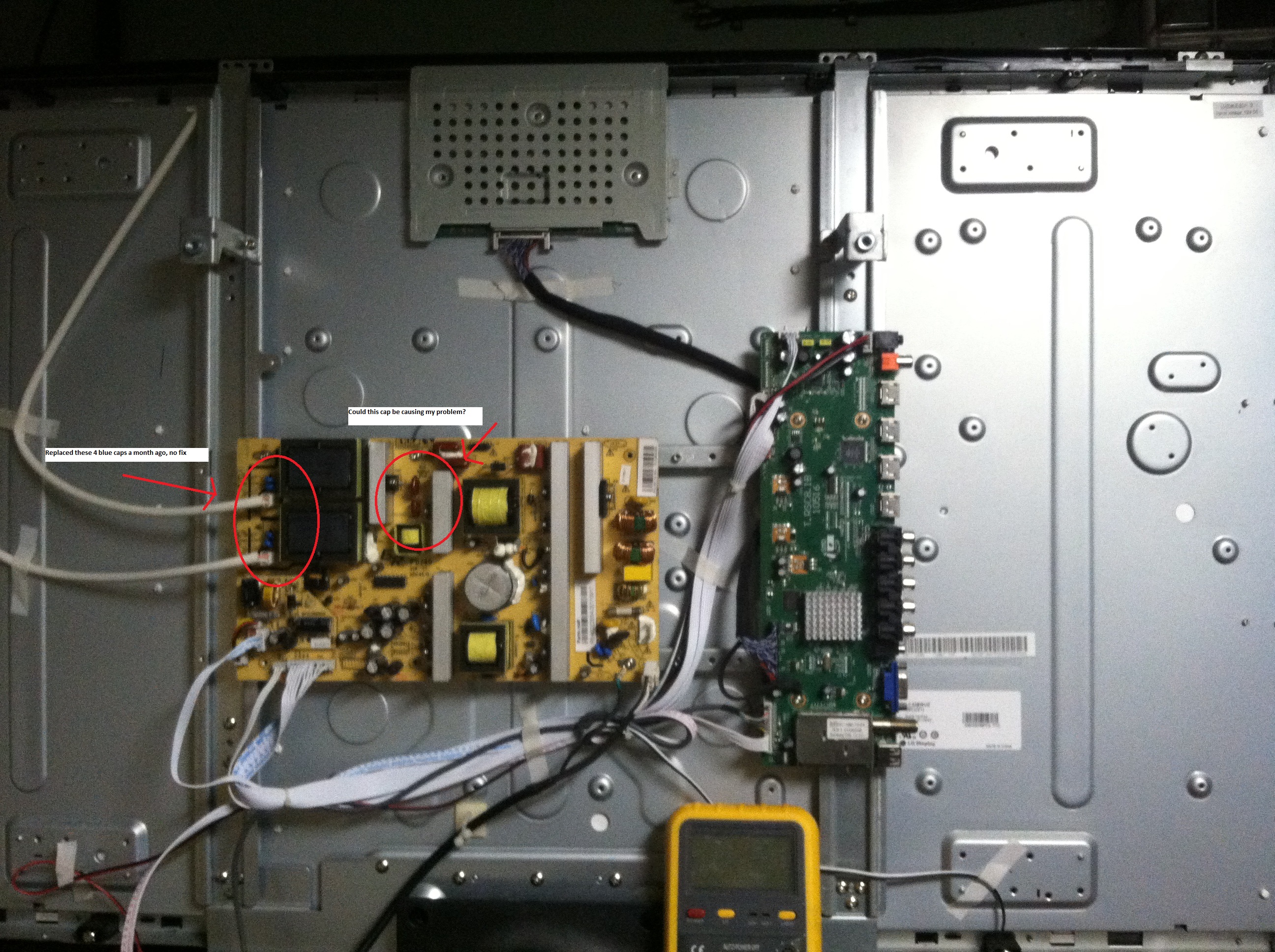 I have search/read treads relating to this model # and replaced recommended blue high voltage caps near the output from the PSU to the inverter (4 total). No fix.