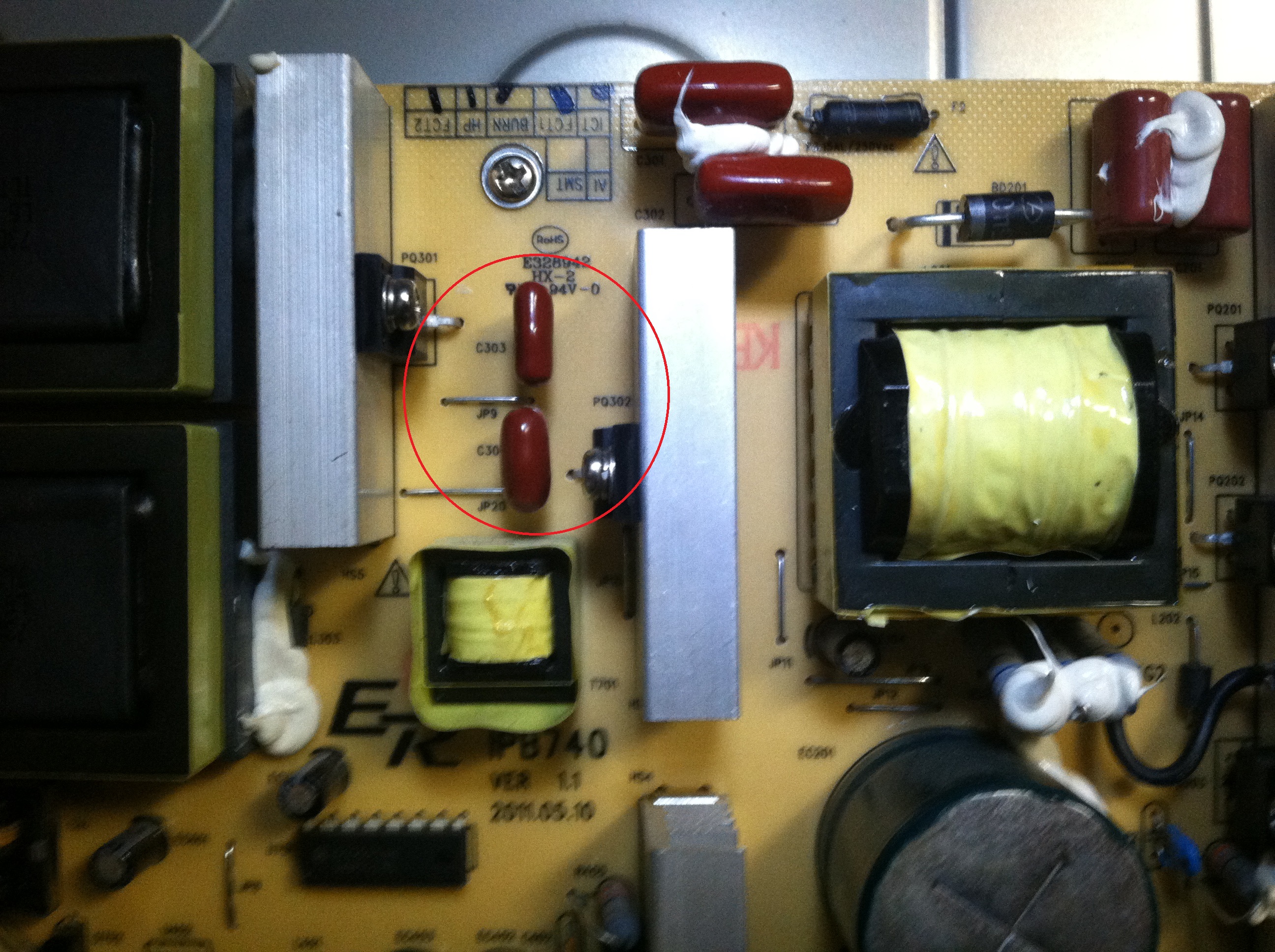 I did find another high voltage cap that is bigger/expanded than the same value cap next to it. Could this cap be causing my problem(630V471K)? I've included a picture showing its location on the PSU board.