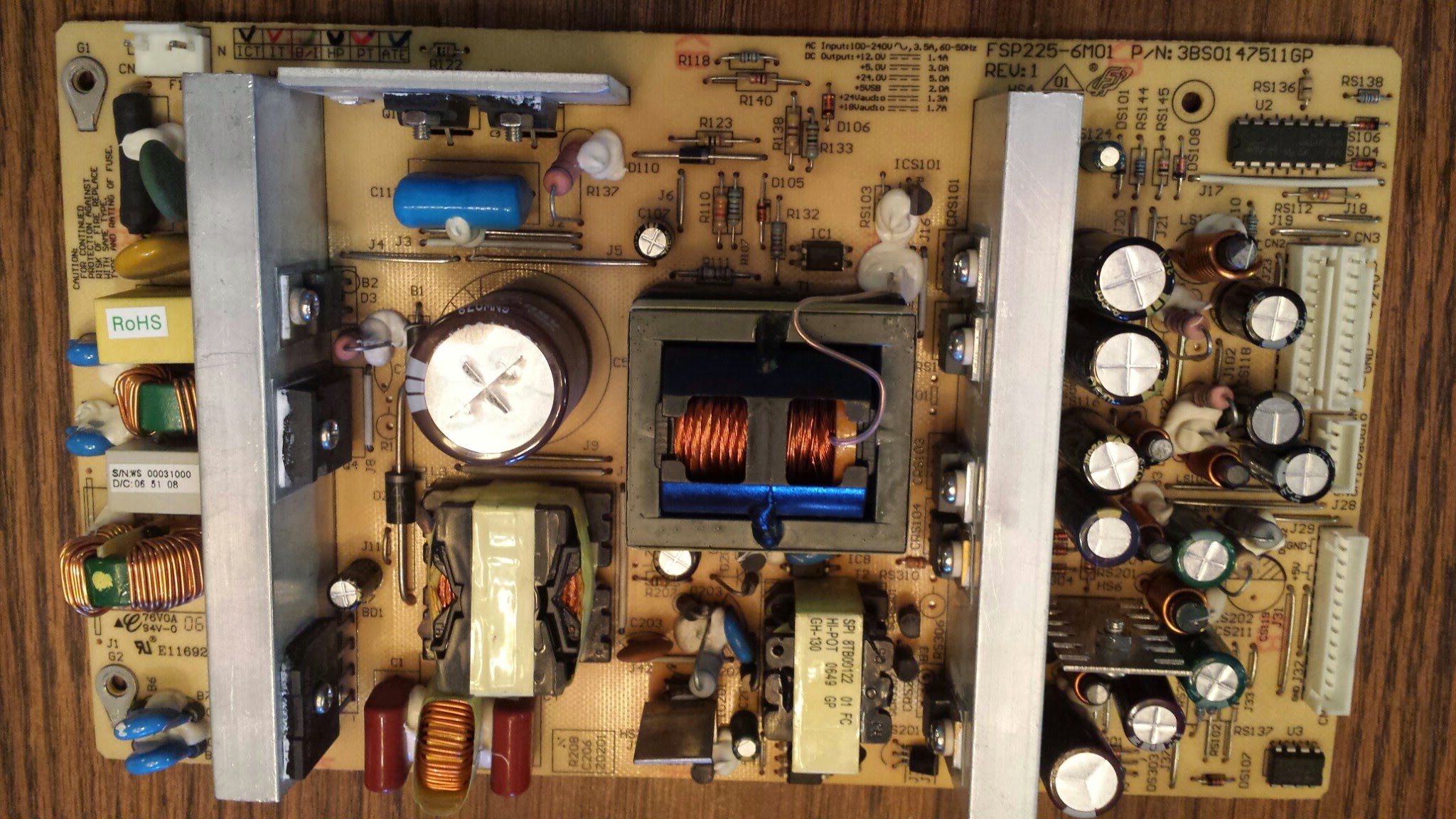 I am working on this TV/Monitor. I have a no start up condition. I suspected problems with the power board. When I pulled it out I found 4 capacitors had been replaced. They were not even soldered in correctly. I soldered them up but still have a problem. I can here a steady clicking from the power board and no picture.