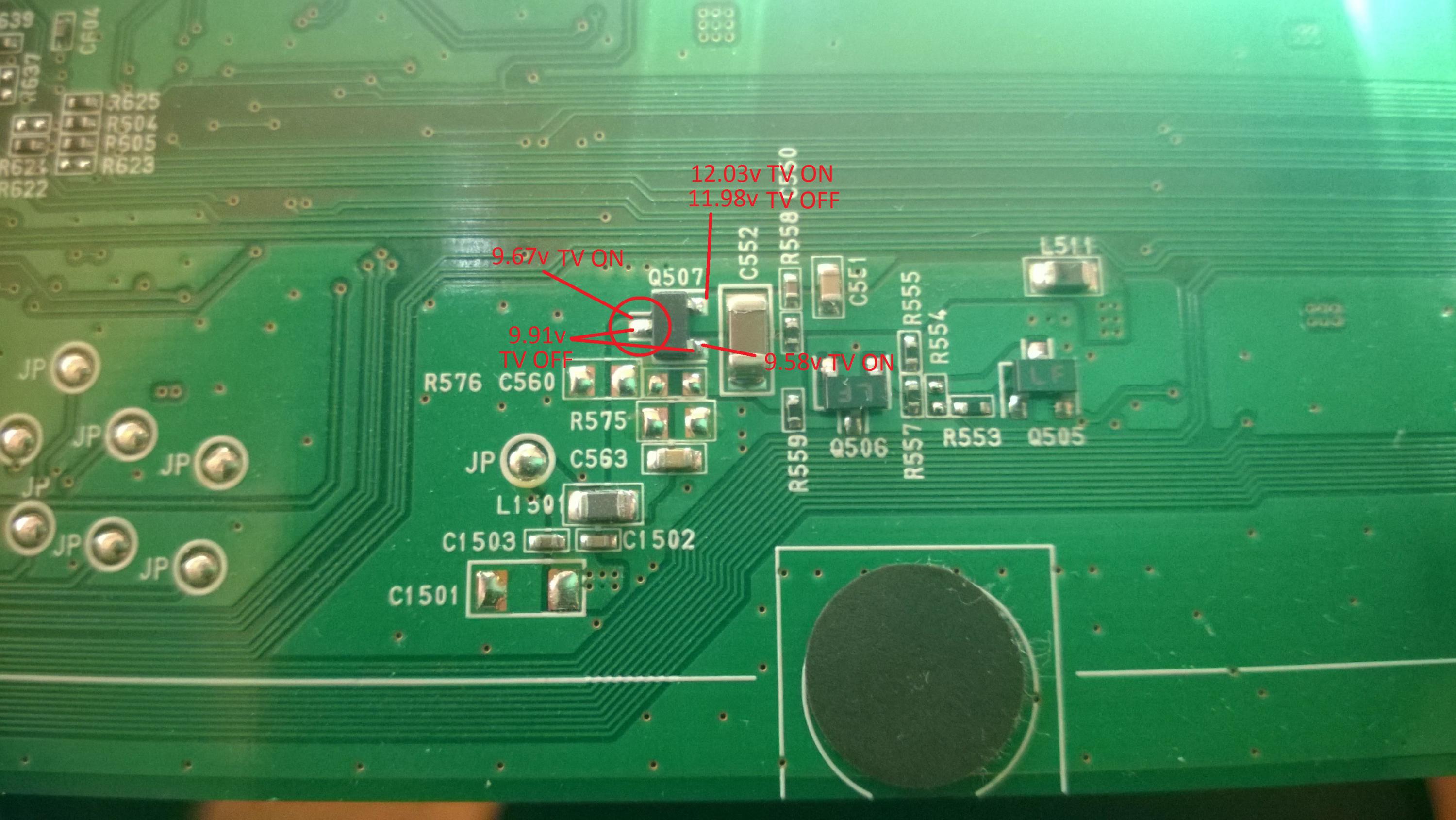 Next moving to TCON board (second picture). First I measured the fuse when TV off, it gave 1 ohm and 9,9v at both ends. Then I turned TV on and measured 9,72v at both ends of fuse and following from testpoints: