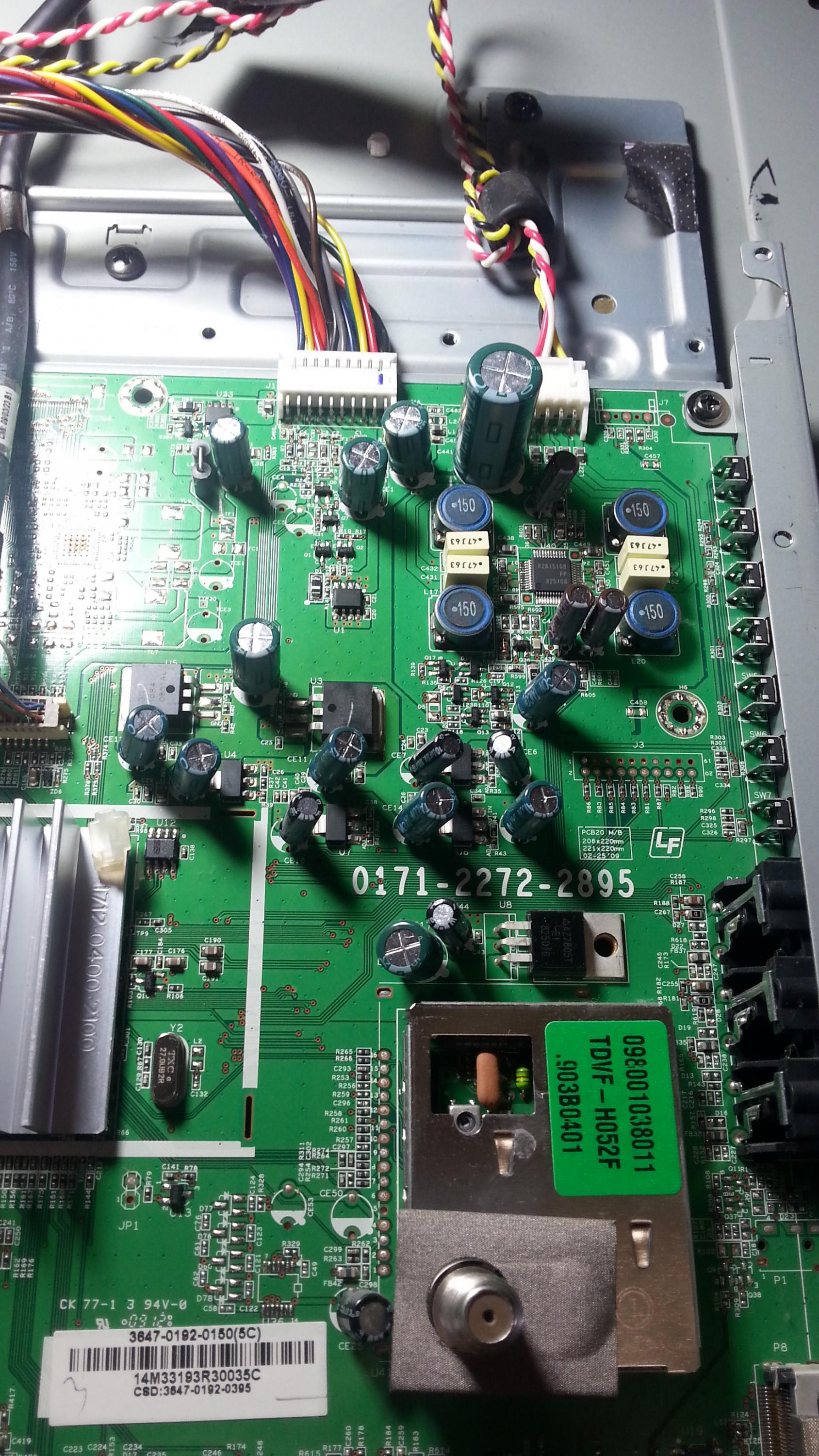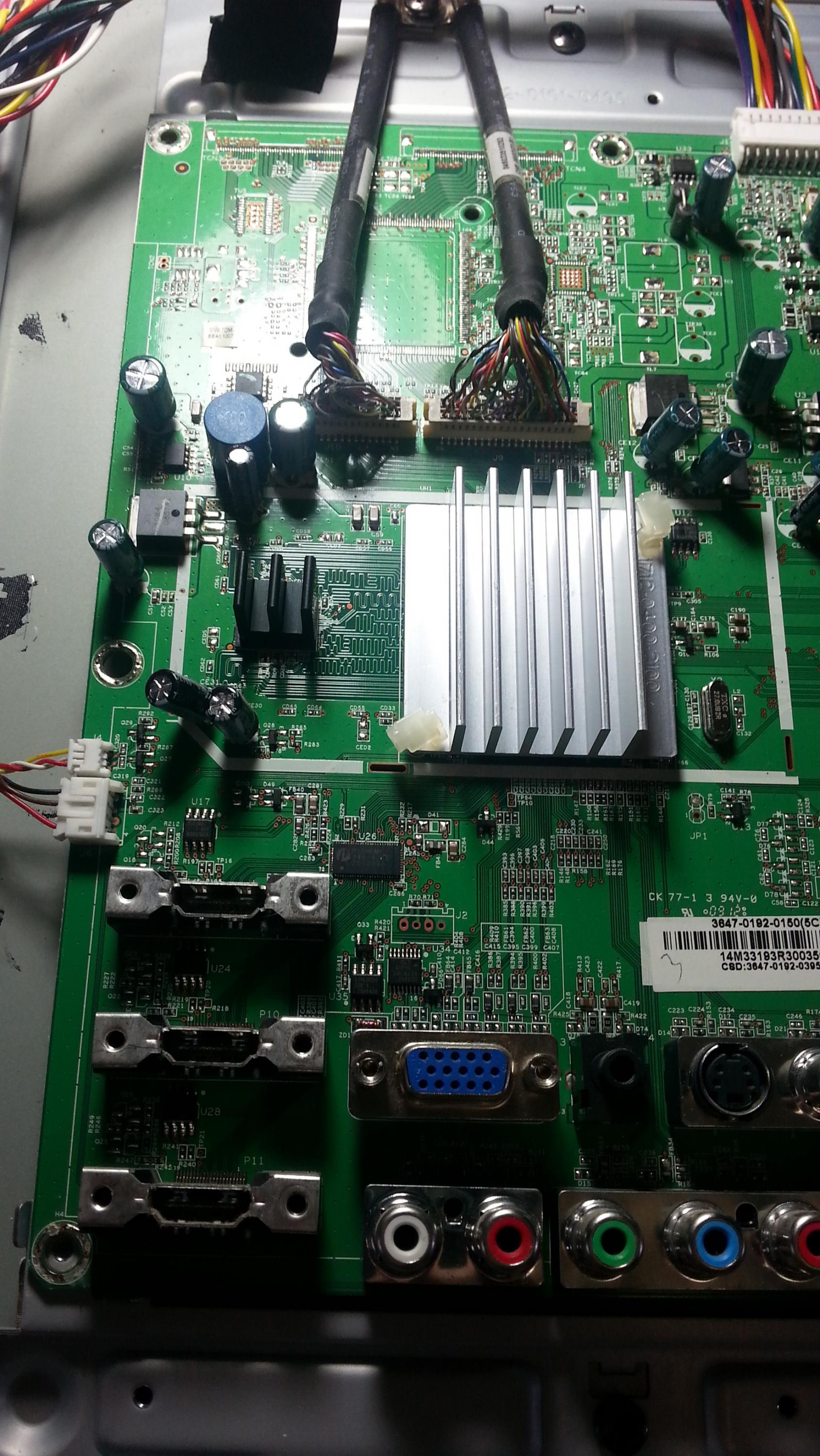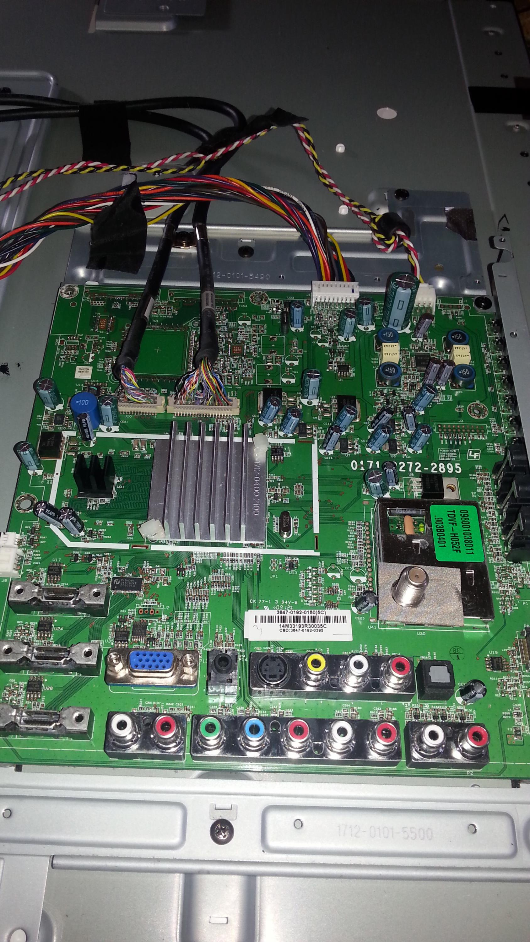 Hello all. I have a Vizio SV420M that's giving me strange symptoms. When I plug it in, the power light immediately turns on, completely bypassing standby. There is no picture or backlight and it doesn't seem to react to any of the buttons. The only way I can get the white light to turn off is by unplugging it. I'm not really sure where to start on troubleshooting this thing since the problem seems odd. Any help would be appreciated. I've attached photos of the boards.