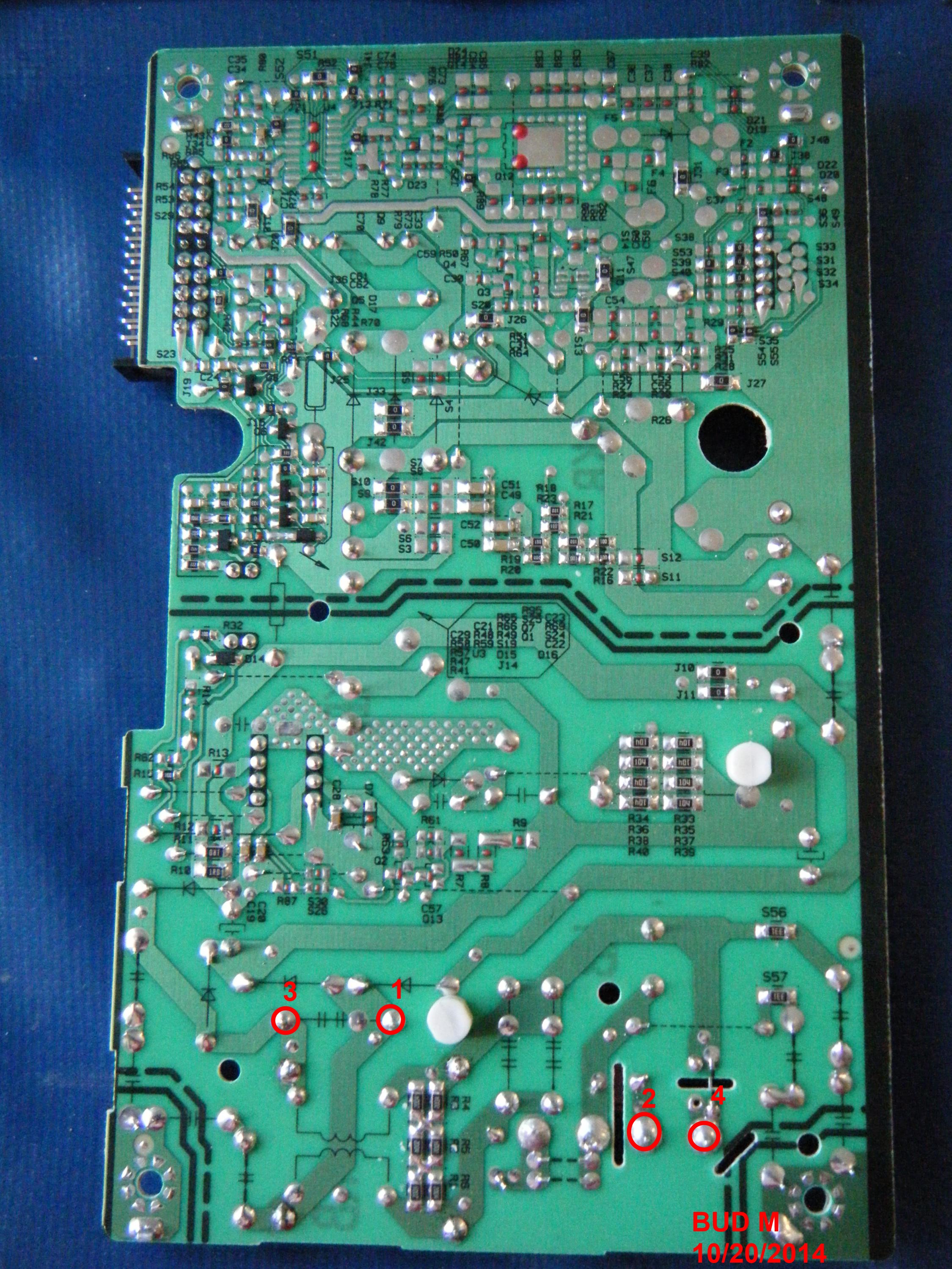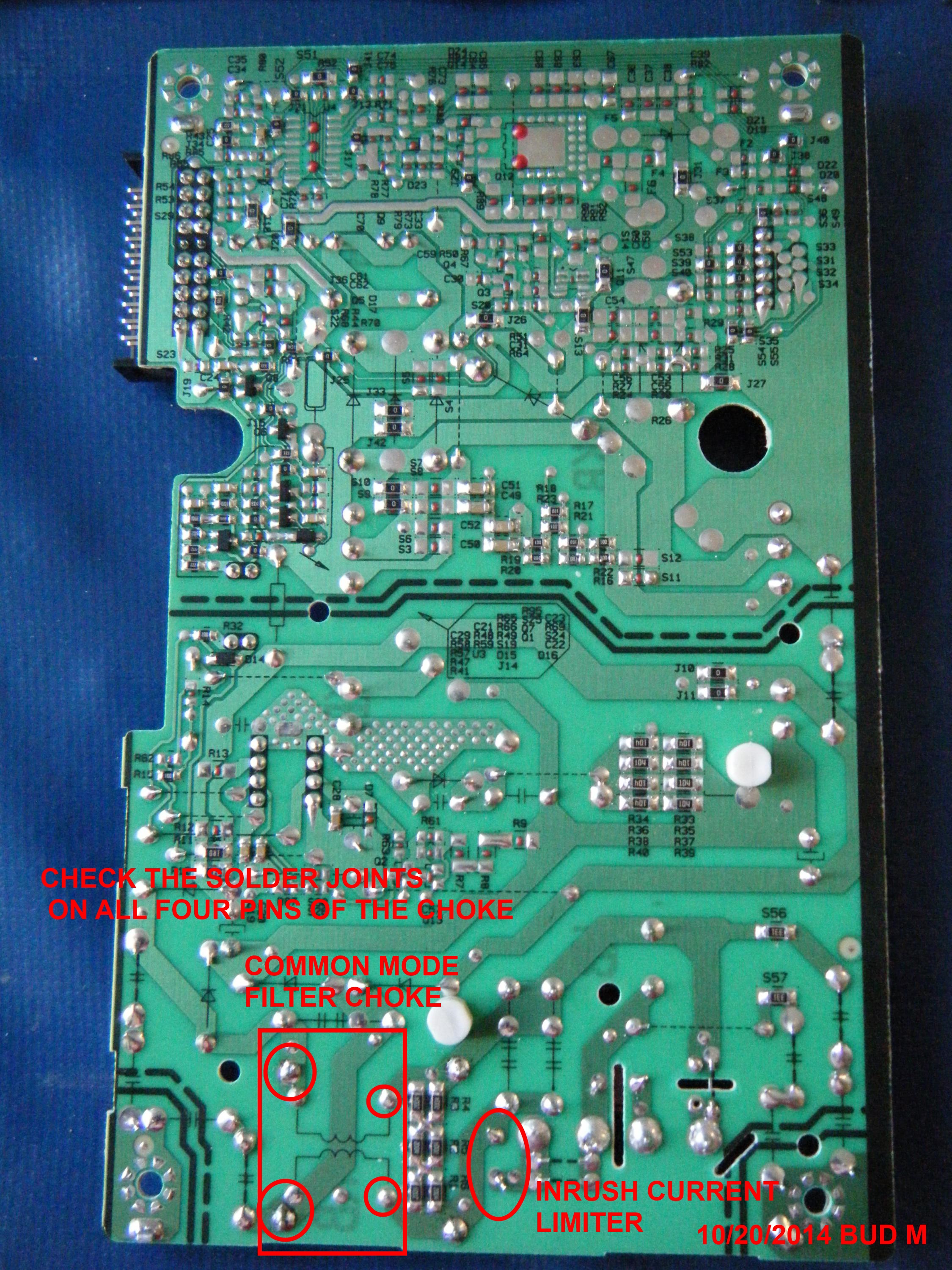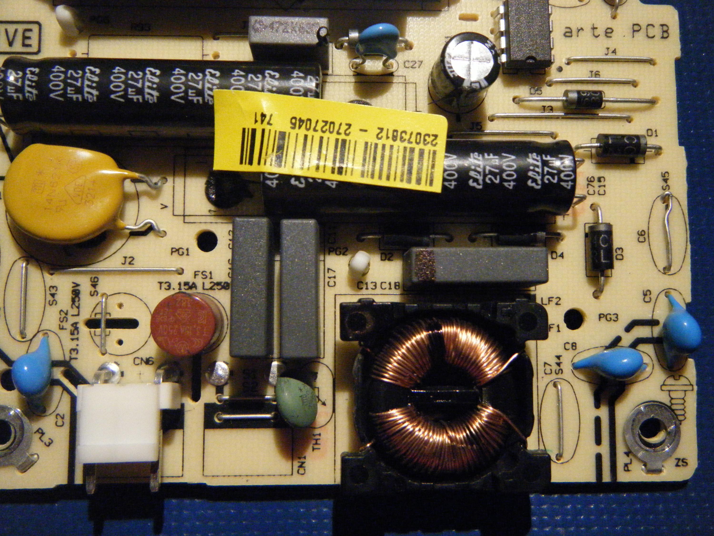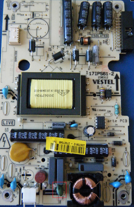 OK so set is dead, I removed the rear cover to find the black mark on the inside of the rear cover, it seems to line up with LF1 (with copper coils on it) to be honest not sure what it is, I have used a meter across the four pins, it looks like it is two coils? so checked bottom left to bottom right, top right to top left and both are O/C, checked the diodes and resistors, FS1 one is OK also.