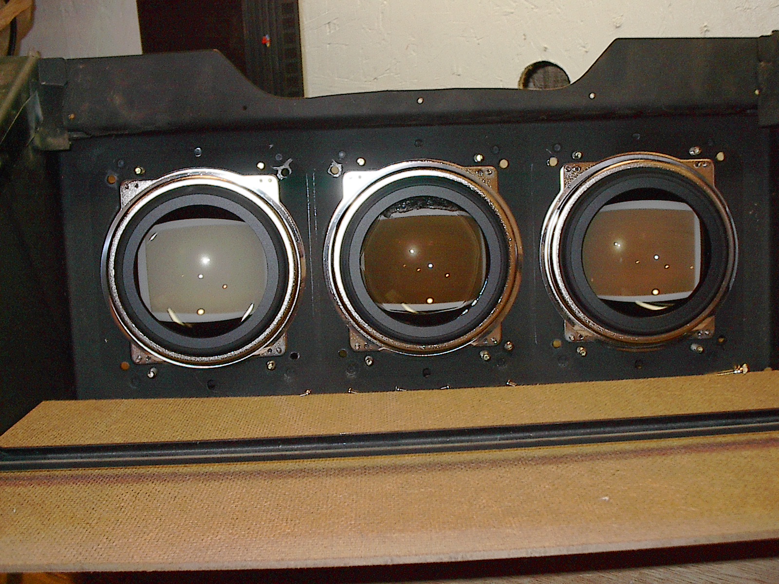 It's too bad that they have this problem with leaky caps, because they seem to be one of the best TV's otherwise. Nice optics, all connectors labeled, sturdy cabinets etc. In fact I had a 32" projection set from 1987 that still worked perfectly, but the tubes were burned so bad it was unwatchable. in fact here's a pic of the tubes.