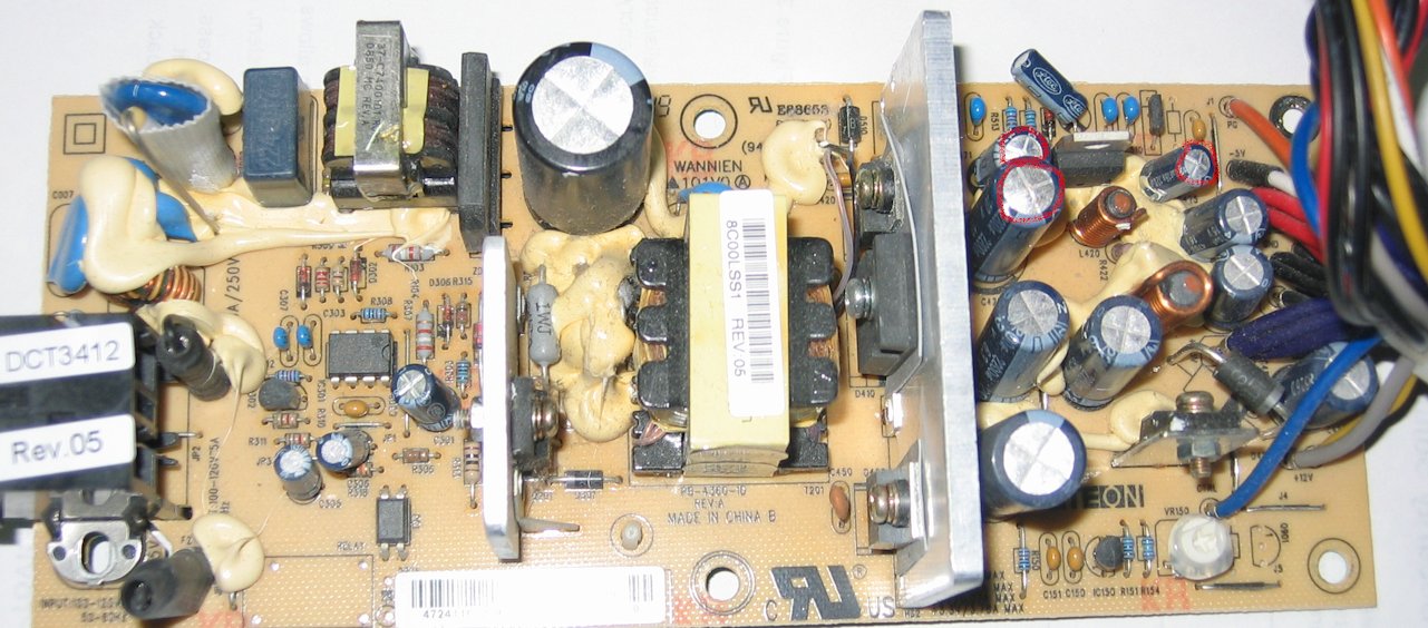 2) The power supply outputs 12V, 5.0, 3.3V and -5.0V according to the silkscreen legend (obscured in the picture). Without the main board connected, the 12V rail flucates crazily from around 3 to 9V. Once everything is reconnected, the 12V is a solid 12.11V.
