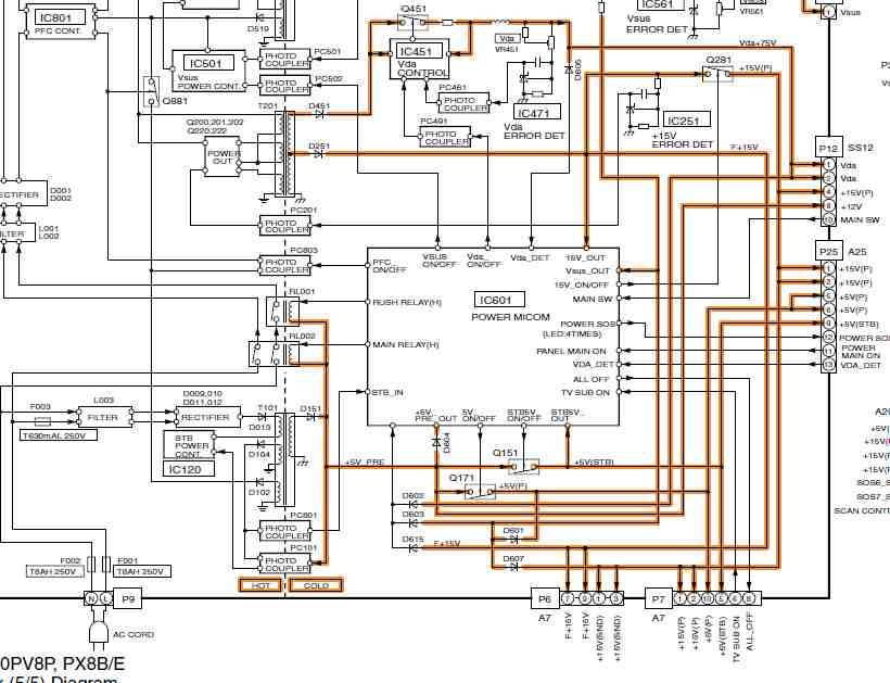 The TV is dead no voltages at all on the outputs. There is AC across F002 but no power across any other fuses. I don't hear the relays click. Relays are 5vdc. I can't find a schematic for the