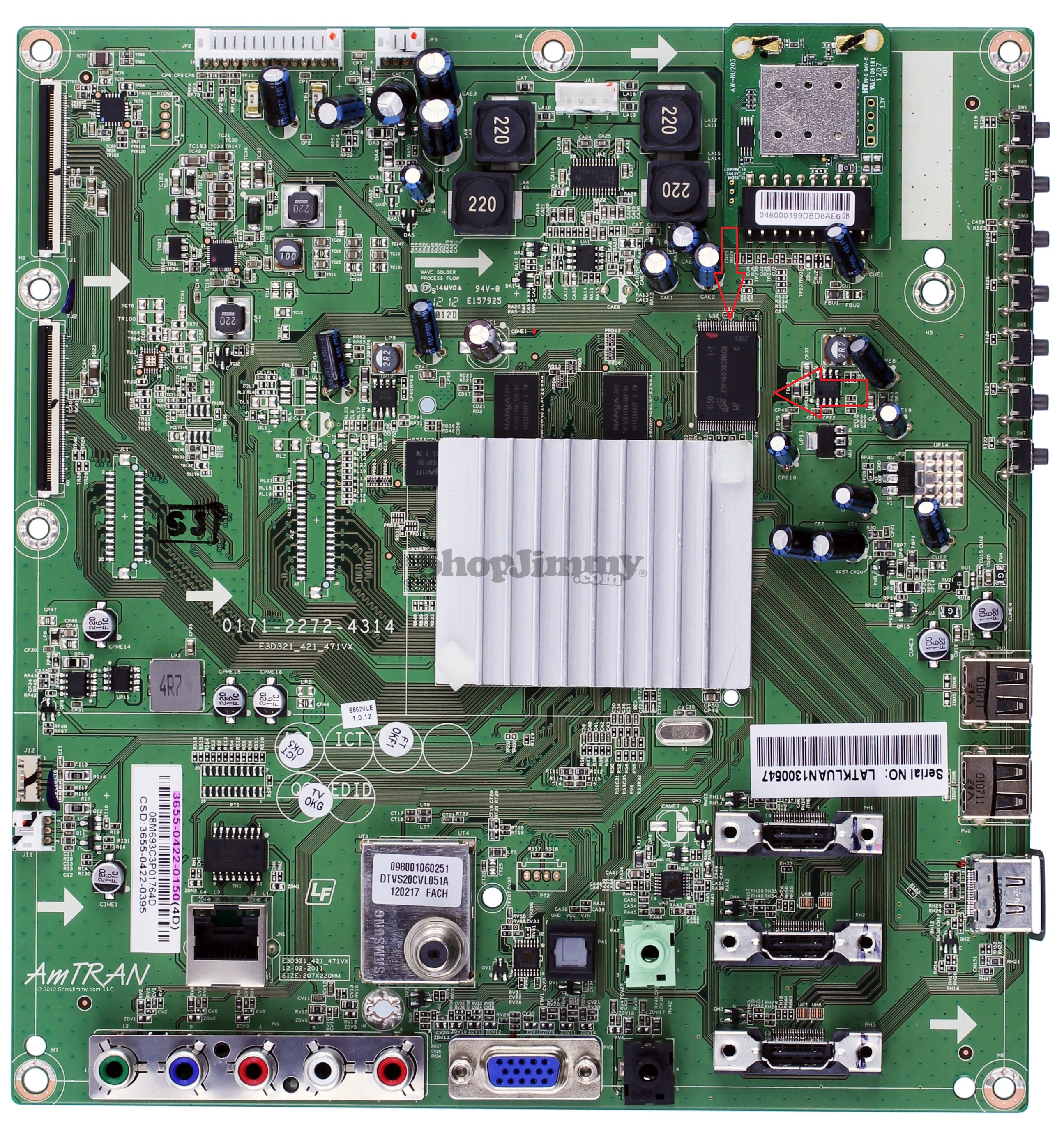 This is your EEPROM chip (see red arrow), try using a heat gun to heat up the chip and then try to power up the TV. Don't use too much heat, heat up the chip for about 15 to 20 sec.