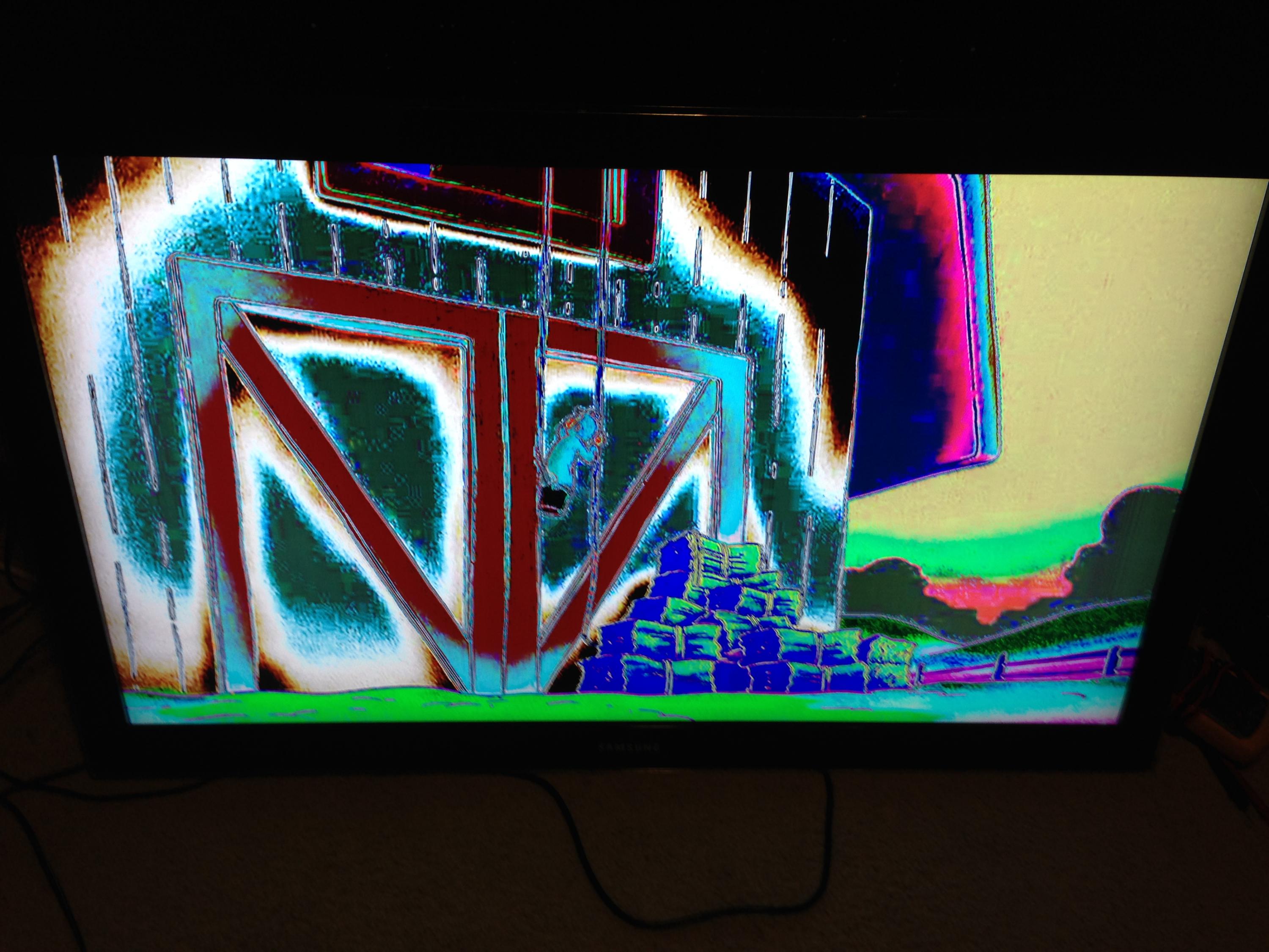 I did a reset by holding the up arrow and power cycling, and the image was great for about 15 seconds and then it reverted back to dis-colorization. The first two pictures are after the power cycle didn't help 4 days ago. Yesterday, I turned it on again to try to get some more pictures, but now the screen is constantly in the green pattern that used to just be during startup (picture 3).