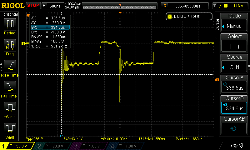 Scope traces attached show the extent of the FAIL in this design. Note that this set had 1kV diodes installed after a repair. If the set had 100V diodes installed the voltage would be clamped to not much more than 100V dumping tons of energy into the diodes. In operation the reverse voltage is respected (60-70V peak), but it's the transient that really matters.