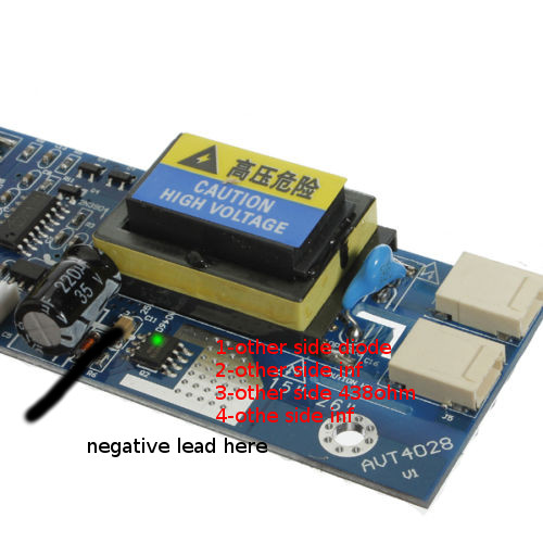 I desoldered all of the original inverter parts, drilled the board and then soldered +, ground, on/off and dim signals to feed this new inverter. Then attached the new inverted onto the board and fit snugly in metal casing of the monitor.