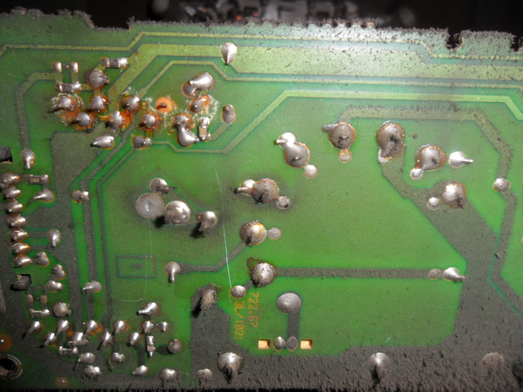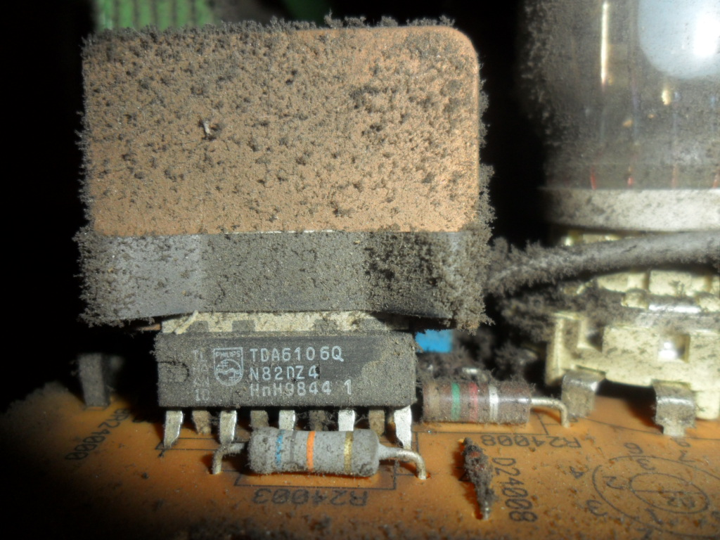 Here I have Grundig CRT TV, problem is that it wont turn on all the time there is some sound like "zzk", "zzk" and repeating in some time intervals. On the board at CRT are "TDA6106Q" and around one of them is pins like somebody was re soldering or so.