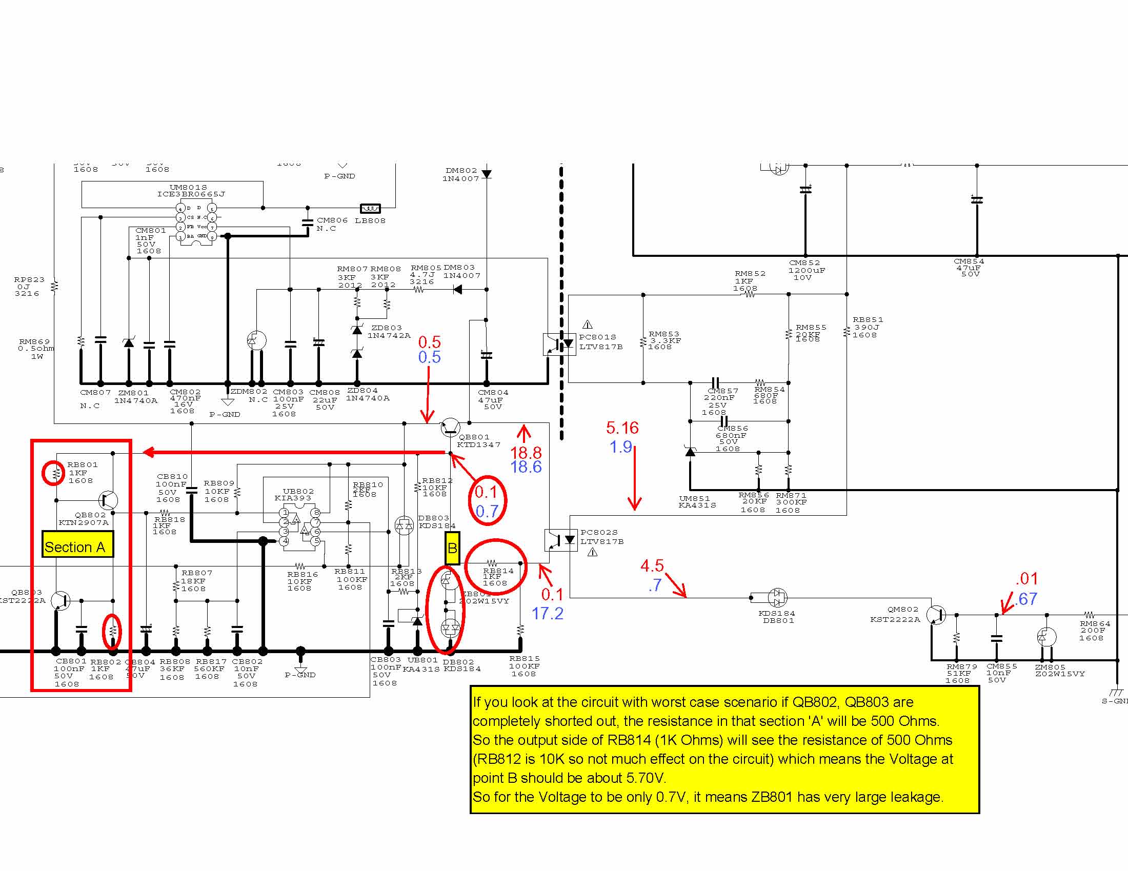 Hi Bud, OK, here is the latest with some crazy theories so bare with me. We pulled the 15 volt zener and tested it, found regulating properly so refitted it. Now to save putting the board in and out of the TV, I decided to rig up a variable DC supply to the collector of the opto coupler with a 1 amp diode bridging the opto to simulate it turned on and powered up the bench supply. low and behold, 15 volts at the emitter of QB801. Pulled Fuse FM802S and fed a second low voltage DC supply into the junction of resistor RB807 and RB816 to simulate the divided sensing voltage from the PFC. The figure I calculated if the PFC was running at 400VDC (approx. value) would be 2.78 volts. At this sensing voltage, the regulator kept running. I increased the sensing voltage until the op amp tripped and this happened at 3.6 V ( converted over the voltage divider network, this would be approx. 510V PFC). When the op amp tripped, the result at QB801 was exactly what we saw when installed in the TV, Collector volts at 18, 0.7 on the base and 0.5 on the emitter. All this at the moment makes me think that when the PSU is installed, the PFC is actually overvolting and tripping the voltage sensor (UB802) and shutting down the PFC controller. A quick check of RP809,810,811,812,813 and 814 the values appear good in circuit. I am looking at the PFC controller (UP801) as the possible culprit.