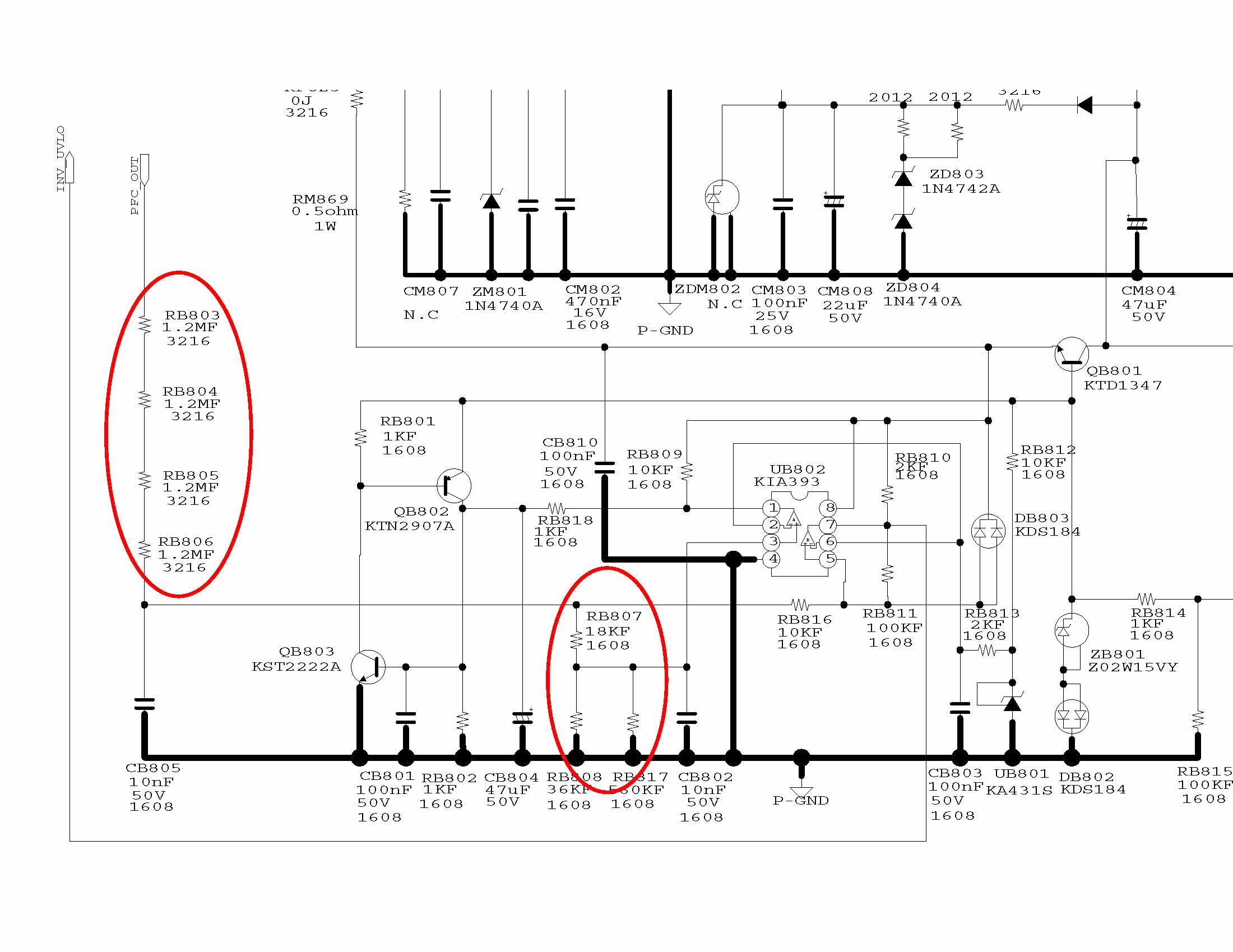 Confusion reigns supreme right now. I pulled RP823, the zero ohm link that feeds the PFC chip ( I saw you mentioned RM869 but that is the current sense resistor for the switch mode,) soldered a 1K resistor onto the output of the reg and powered up. 0.7 volt output from the reg. I then pulled one of the chain resistor group (RB804) so there was no voltage sense going to the regulator and now have 15 volts at the emitter of QB801. (obviously no lights due to link still removed). If I measure the voltage at the main cap, I still only have 330V and this should be below the over volt cutoff. I have checked in circuit RB807, 808,817,803,804,805 and 806 and the divider appears good. I am thinking of pulling all the divider network resistors and checking out of cct now as this is all I can think of.
