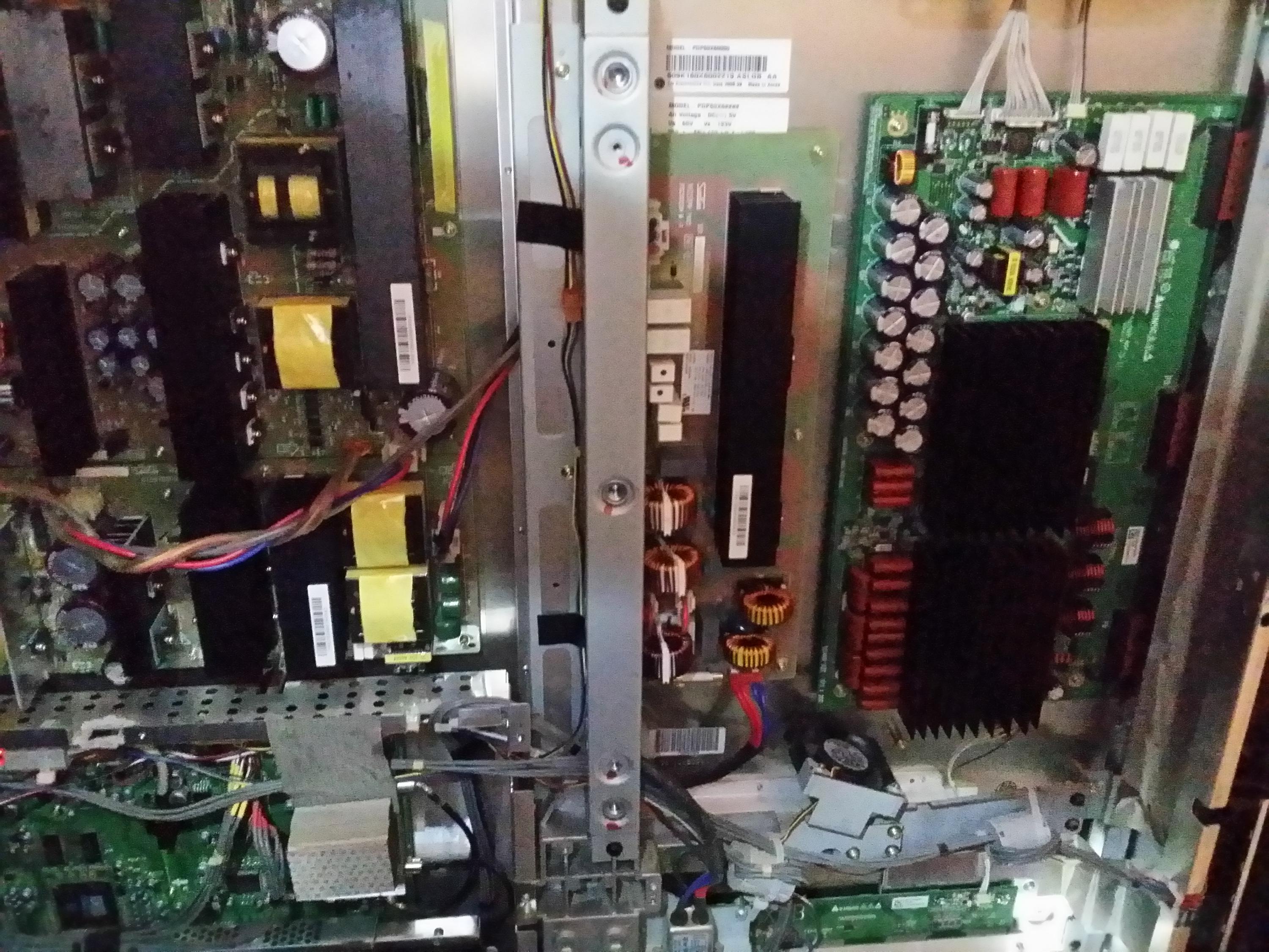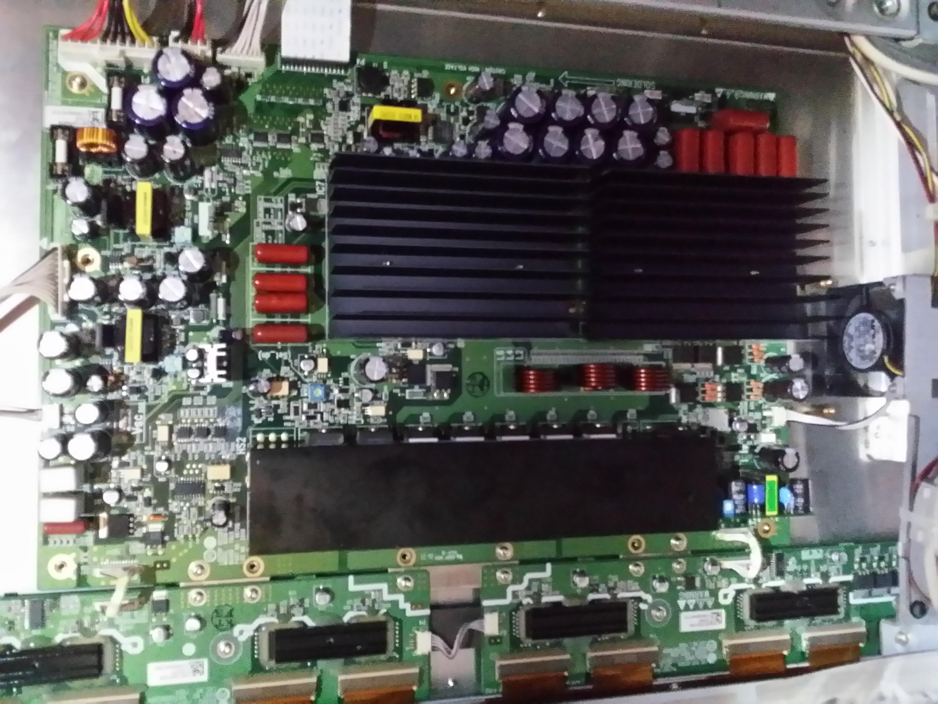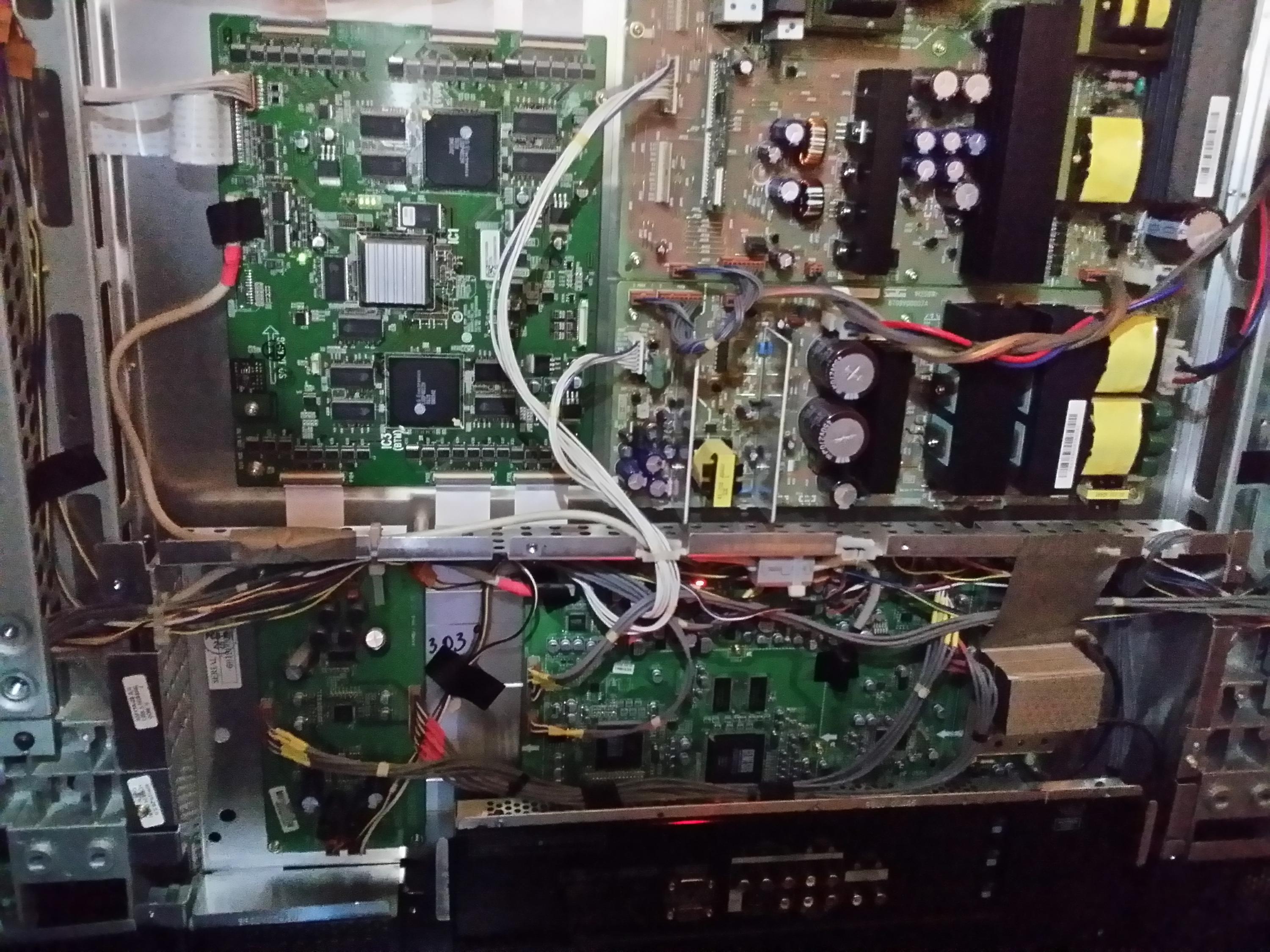 Hi. I have the above model and lately the top half of the screen has been ghosting/flickering. When it is cold it is worse, and top and bottom of screen look bad (see photos). I took the back panel off and by using a hair dryer I traced the fault to a part of the Ysus board. When I use the hairdrier on a section of the ysus board near the voltage regulator with heatsink shown in the center in the (heated area picture), the picture is perfect and gradually gets worse as it cools down. I have replaced 2 smd caps in the area and also the voltage regulator, but it is no different. I thought it would have been a dry joint but I have soldered around the whole area but no joy. Could a bad capacitor cause this fault?