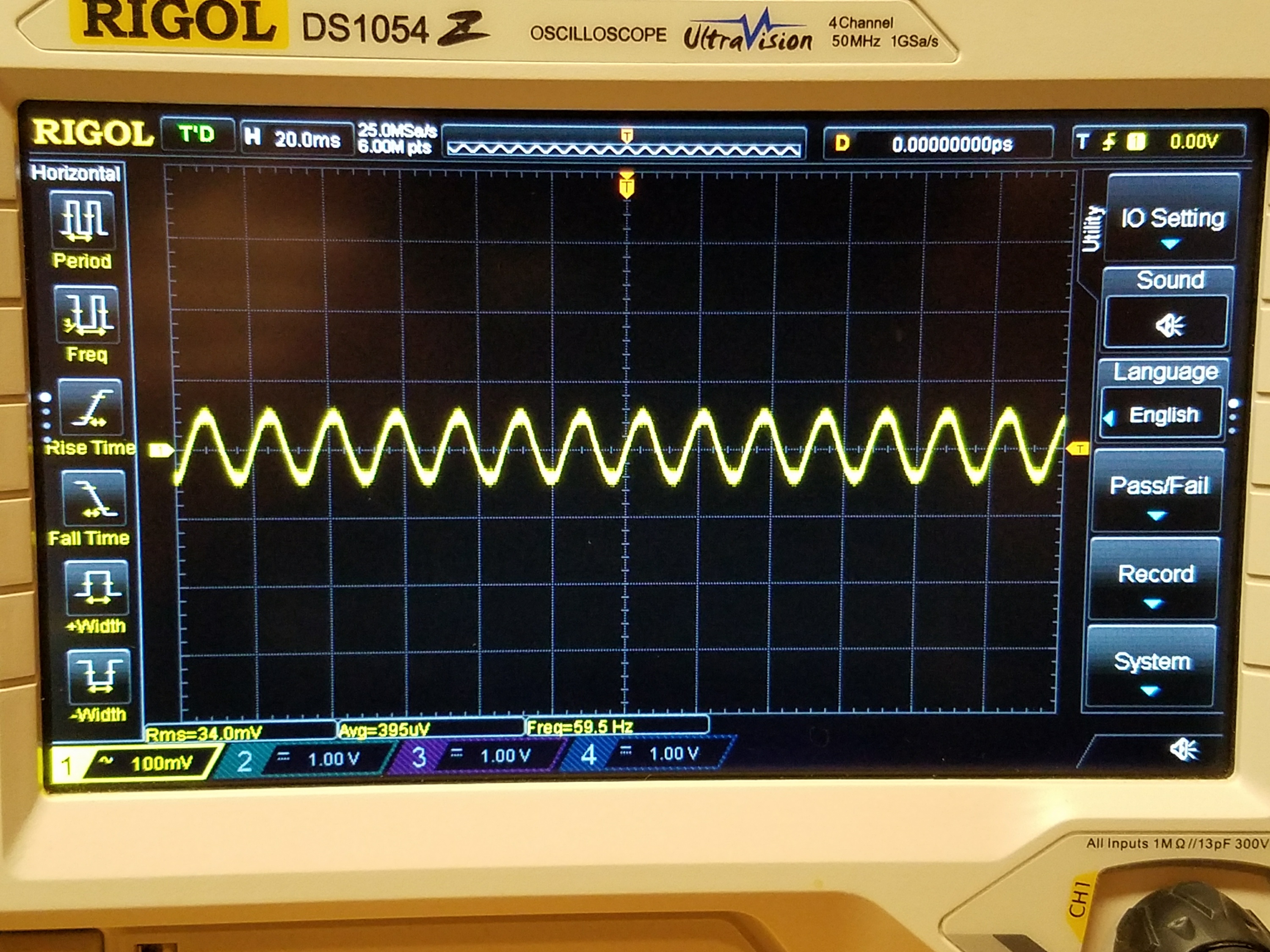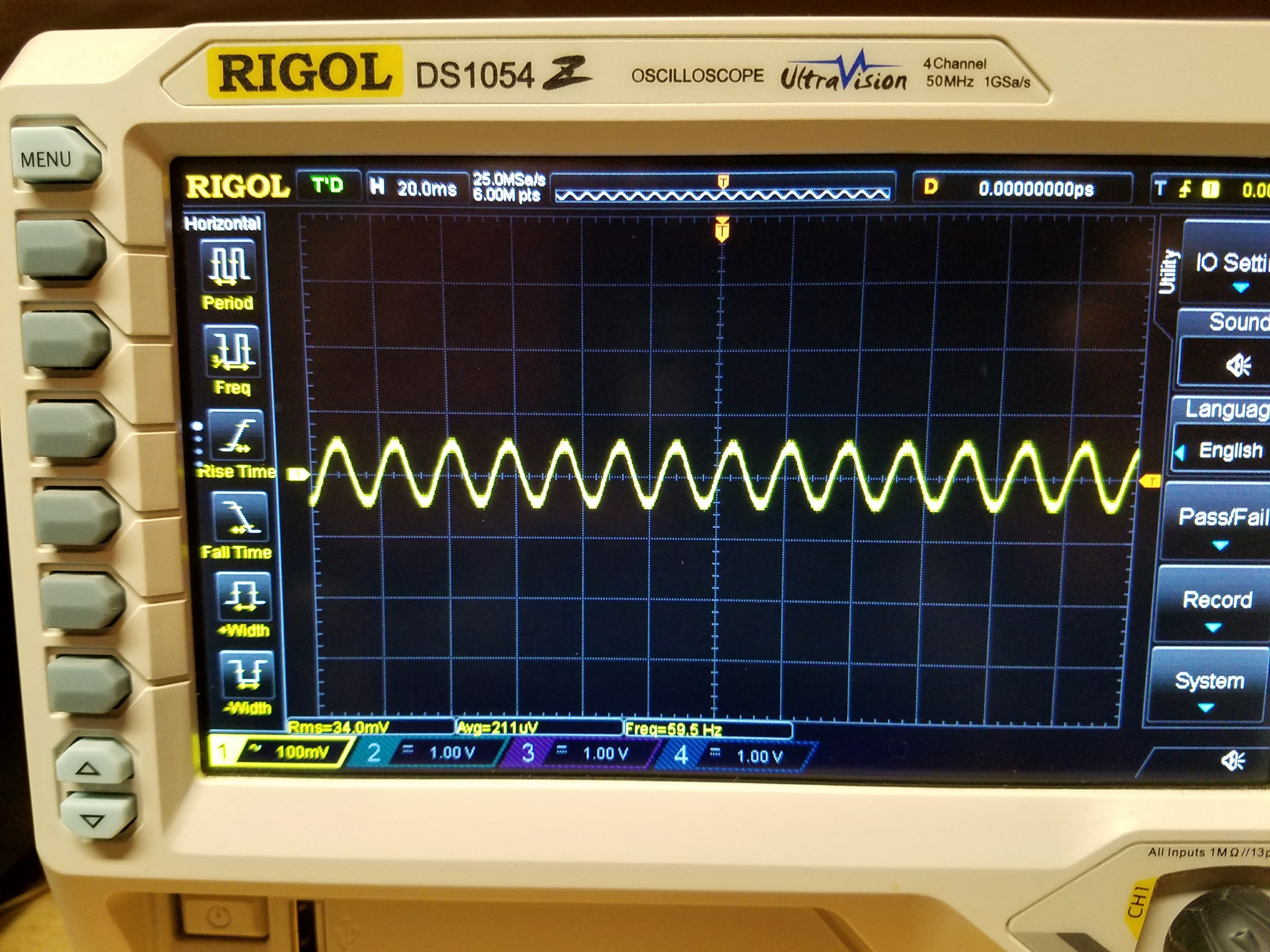 Here's what I see on the scope from the output of the voltage sense circuit. This is not the one in the variac , but the identical circuit. The input voltage is 100V and Ohms law says the output should be 33mv, so it's pretty close, but that 1.3mv that it's off amounts to the meter being over 3v off. The one in the variac is probably more accurate, because I've upgraded to all 0.1% resistors.