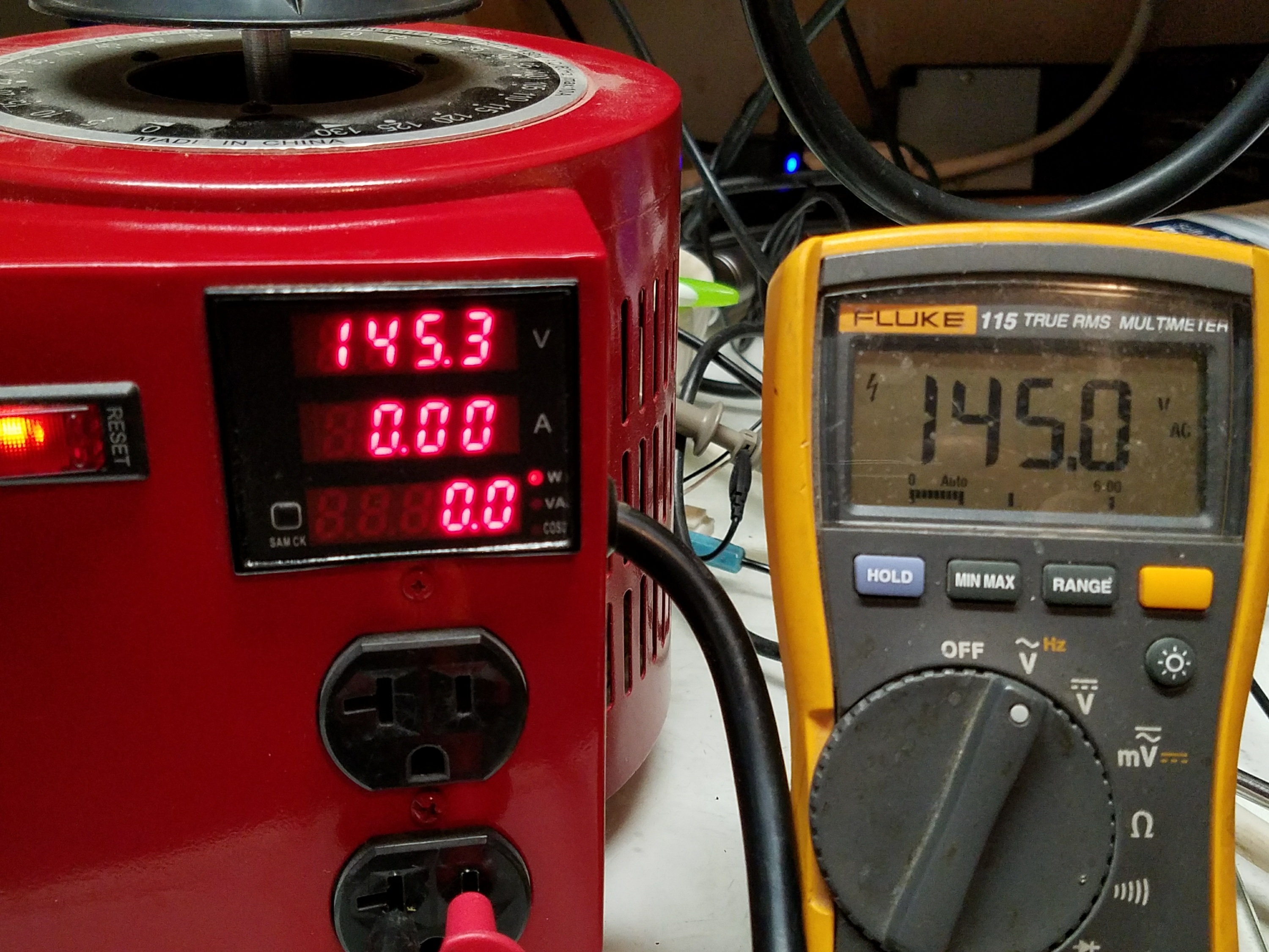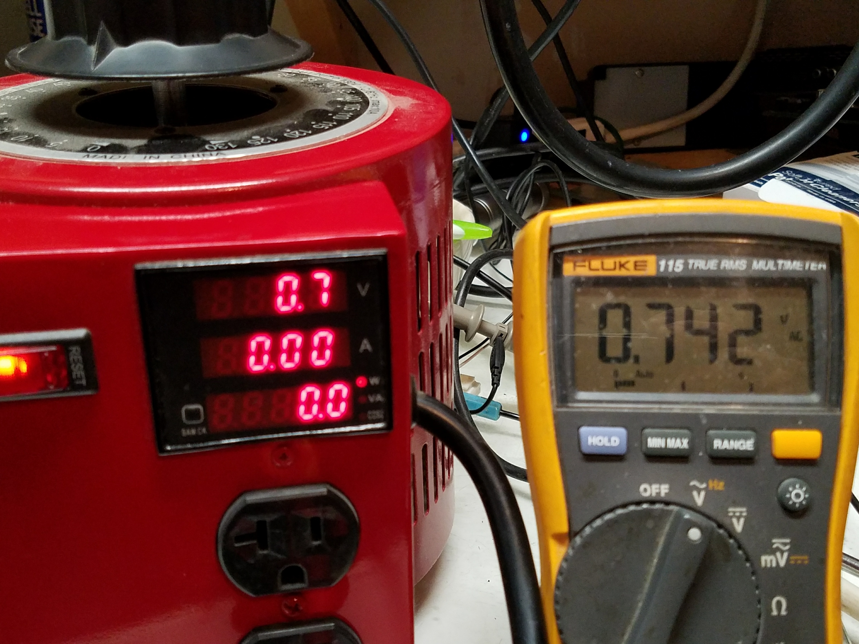 Solved! I removed everything which wasn't part of the voltage sense circuit, and now its within 3 to 4 hunredths of what my Fluke reads at any voltage. Some of that could be from the single digit resolution on the meter. I could probably add range adjustments and more resolution in the software if I could ever identify the micro, or at least figure out how to dump the firmware. The lowest it goes is 0.7v, but that's the variac itself.