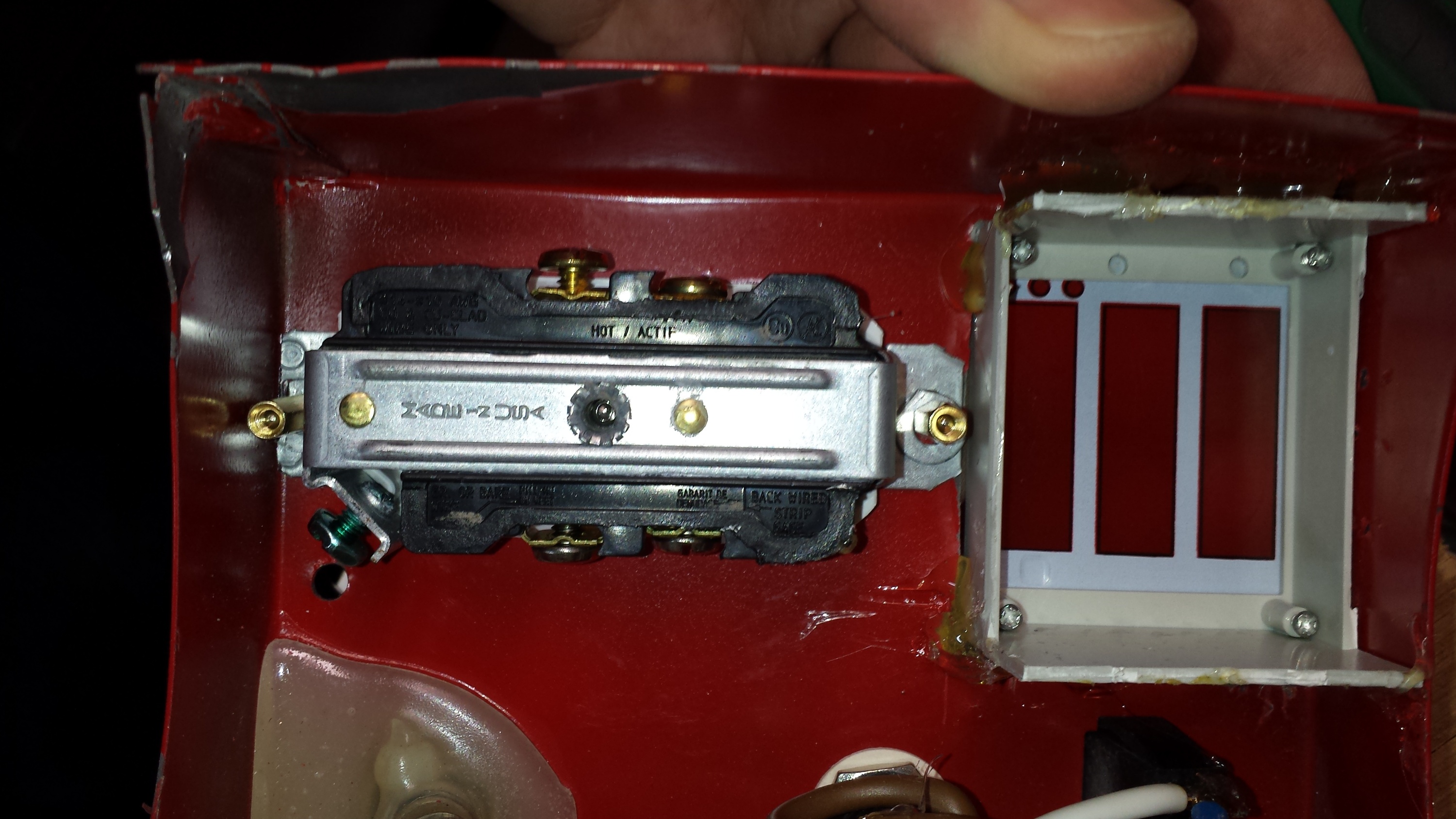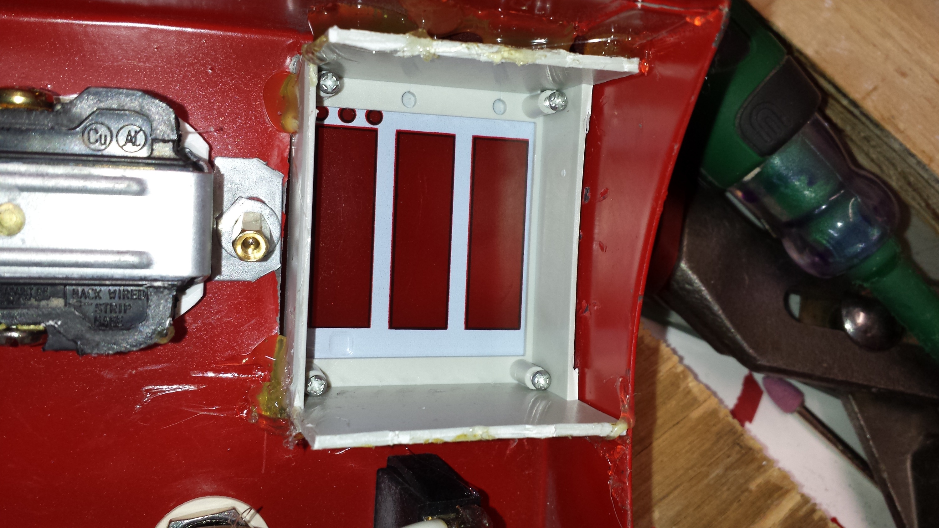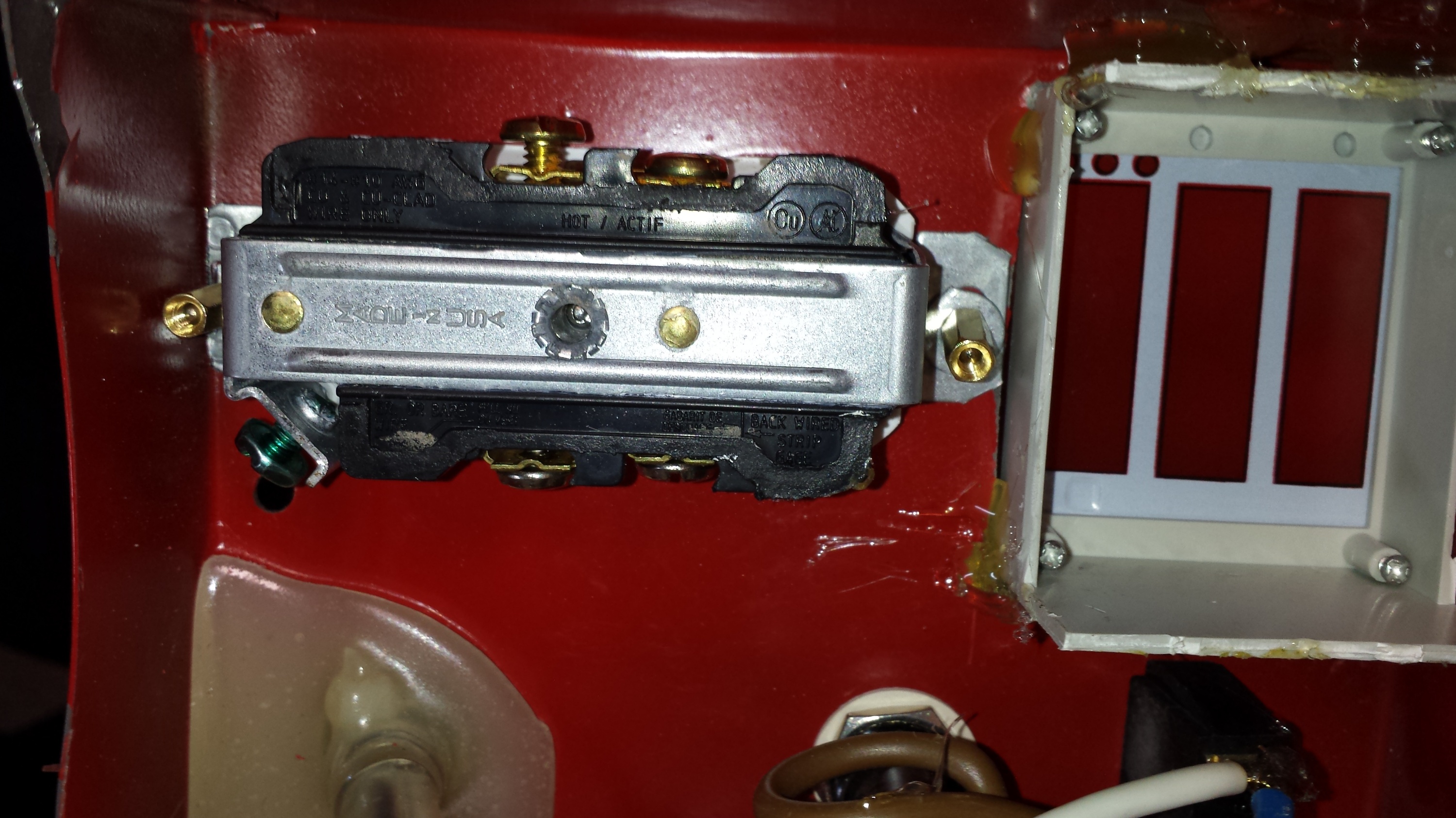 Here's how it mounted up in the panel. Not perfect, but about the best I could do with just tin snips. I secured it with a lot of hot glue and it's solid. I also replaced the receptacle because I wanted to add the other 2 screws so it would be more secure. I'll slap some Bondo on it and repaint the whole thing when I'm finished.