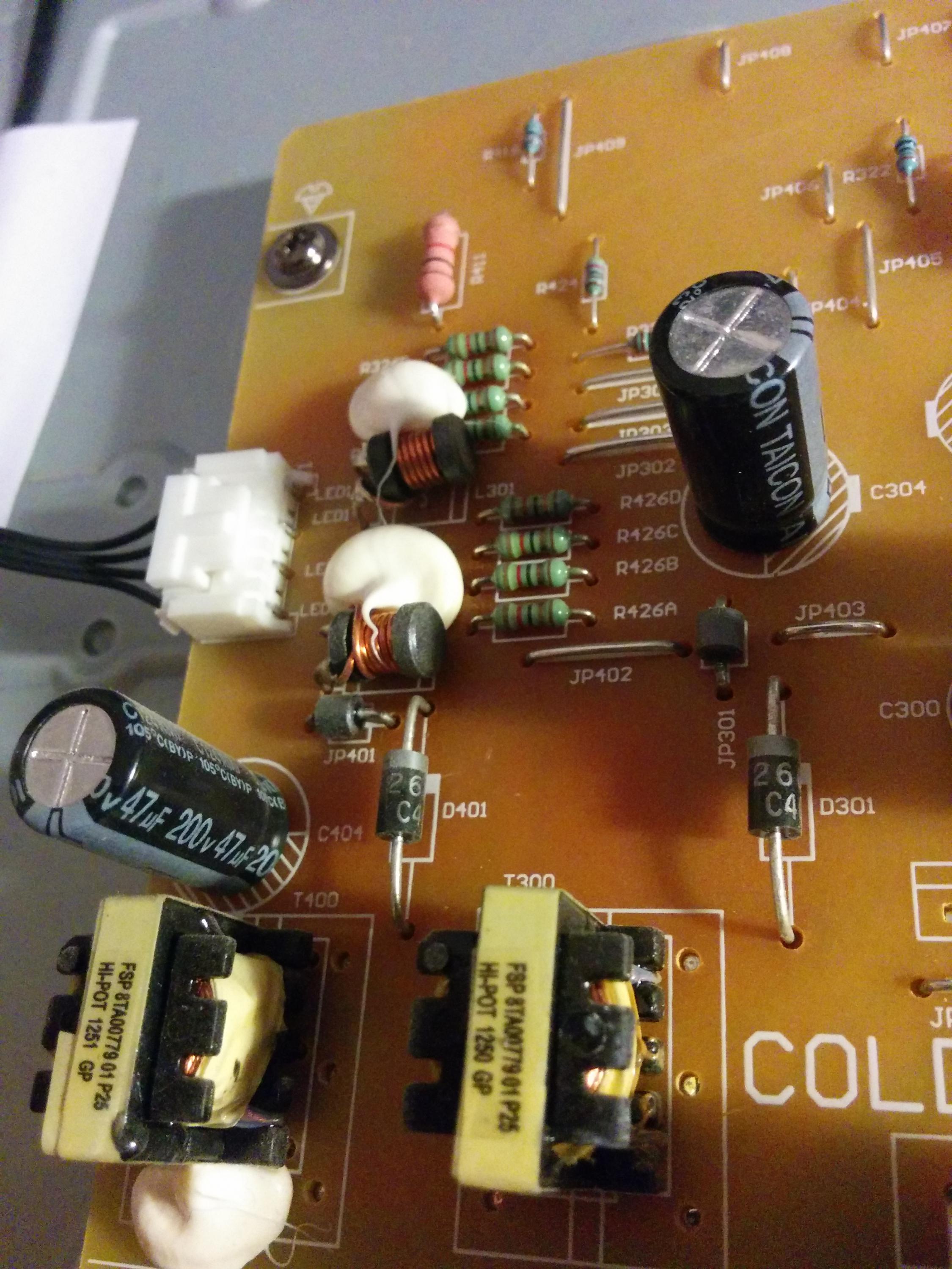 The caps are C304 and C404 both 200v 47uf. I noticed the TV seems to shut off after about 10 minutes.Comment