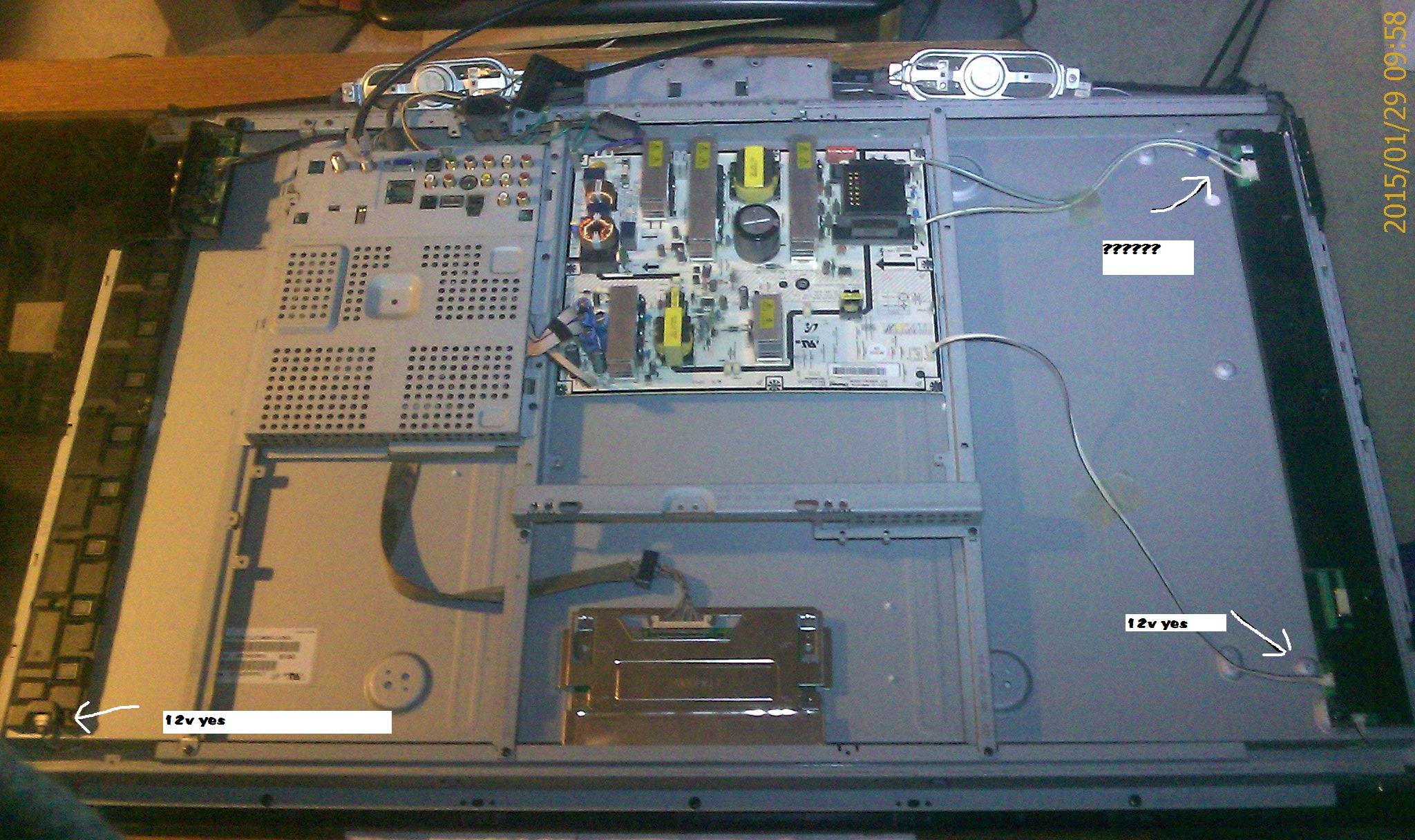thanks budm....ok so the two long boards are not typical inverter boards?....yes i do get 12v coming from ps as shwon in my photo......so you want me to disconnect the power supply connection to the main/input board? and then fire up the tv?....the tv shouldnt power up....that has all the voltages on it....correct?