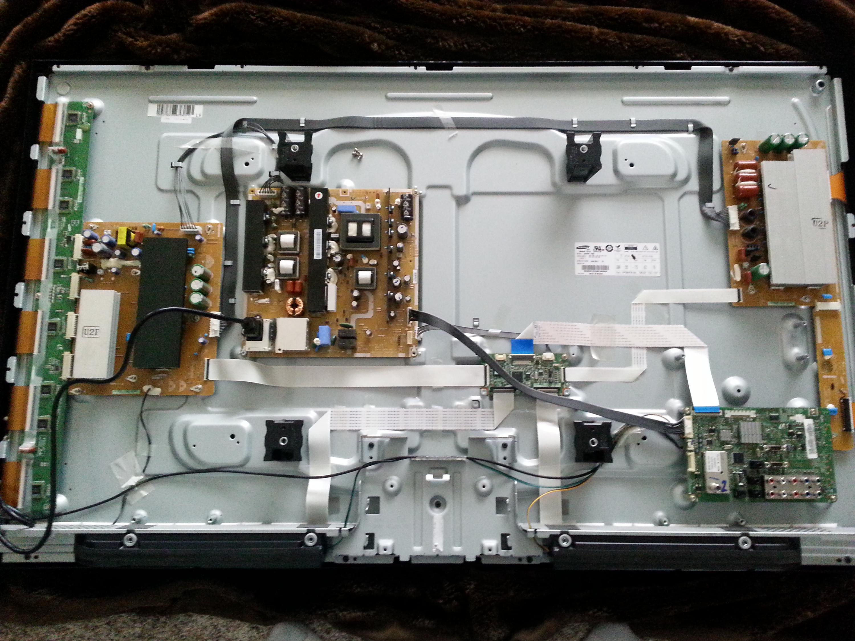 I am attempting to repair an Insignia NS-50P650A11 50" Plasma TV that will not power on. It exhibits the following behavior: Immediately after applying AC to the power supply, the boards two relays click on and after a brief period, the relays click off and this cycle repeats it self every 5 to 10 seconds indefinitely.