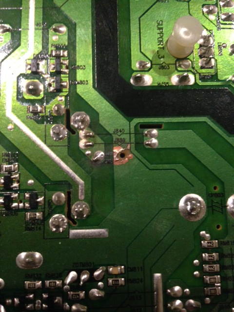 A side issue I had was that I powered on the TV when it had been left out and condensation formed on it. There was a short from a jumper to a capacitor (this seems to be a common problem with this power supply. I saw one in worse shape on another forum.) I fixed the damaged jumper and the TV still powers on. I was planning on replacing the bulged capacitors but now I dont know if it is worth it.