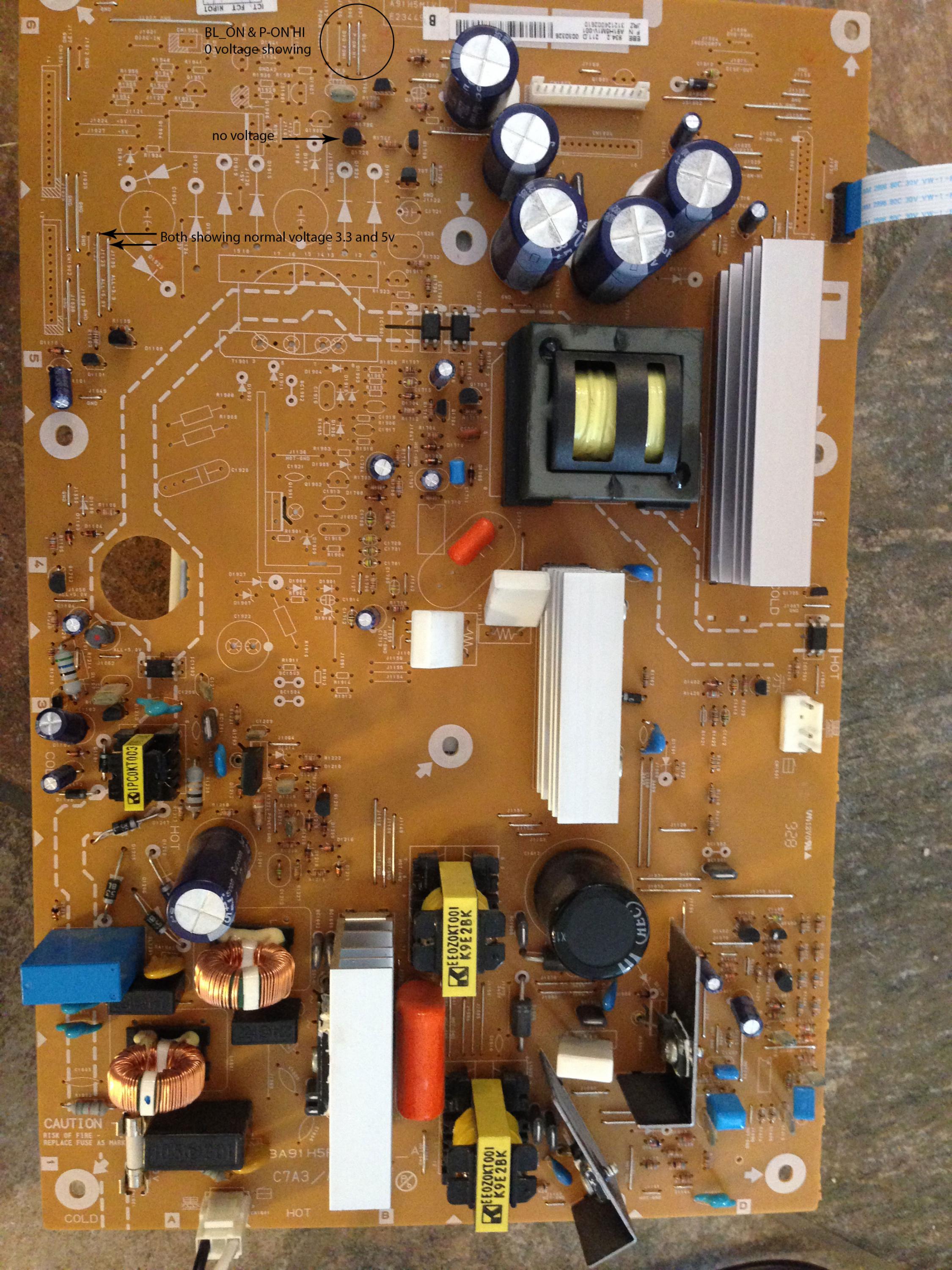 Anyway, a friend has this TV with the above mentioned power supply board which has no standby voltage, nor any other voltages leaving the board.