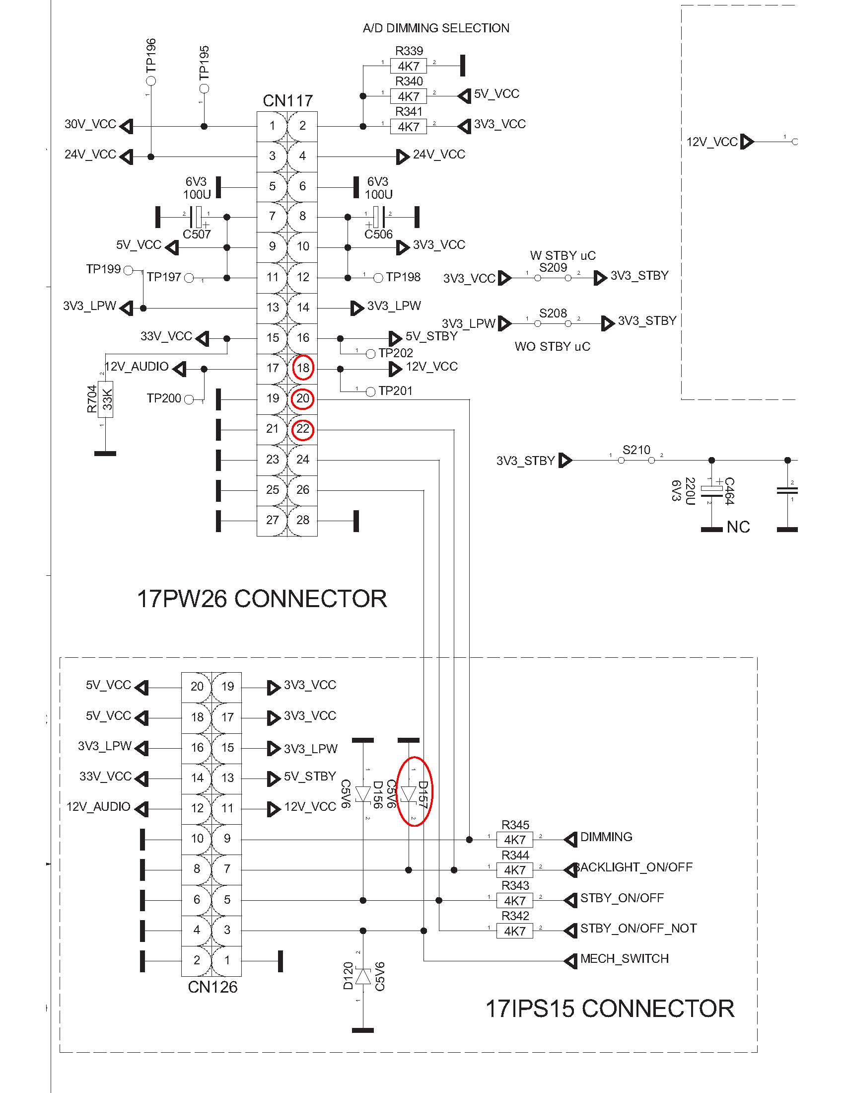 pin 18, 20, 22 (VCC_3V3_ON) of the PL816 of the power supply board are going into motherboard CN117 into pin 8, 10 , 12.