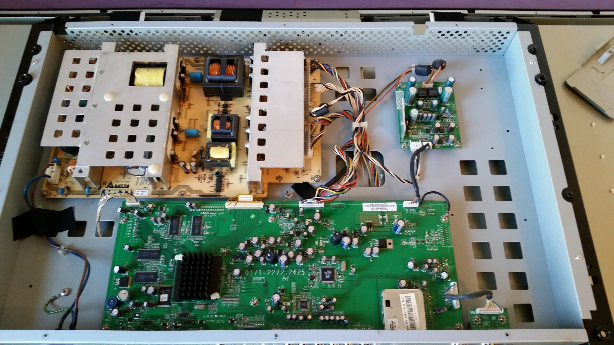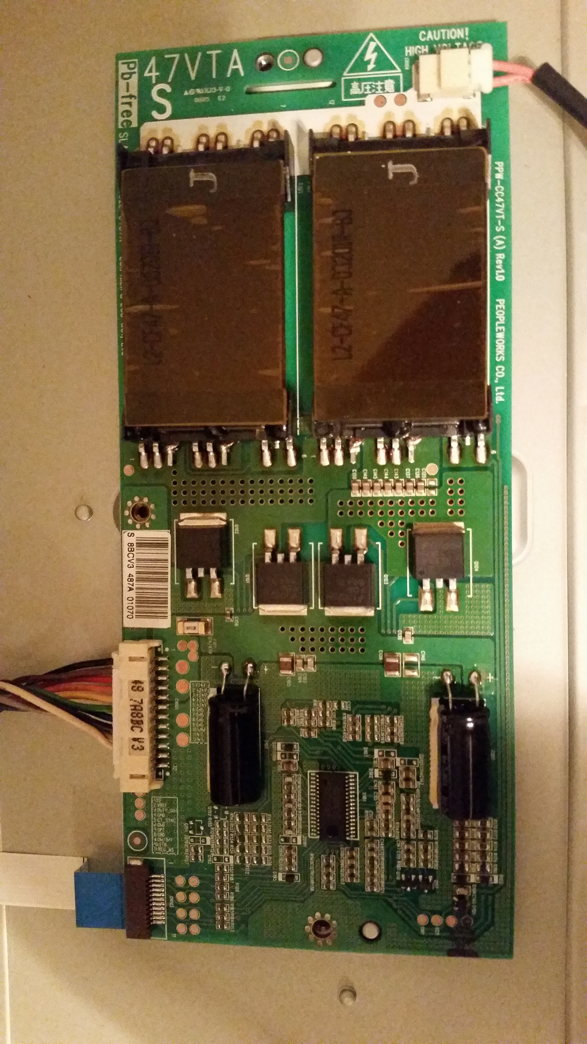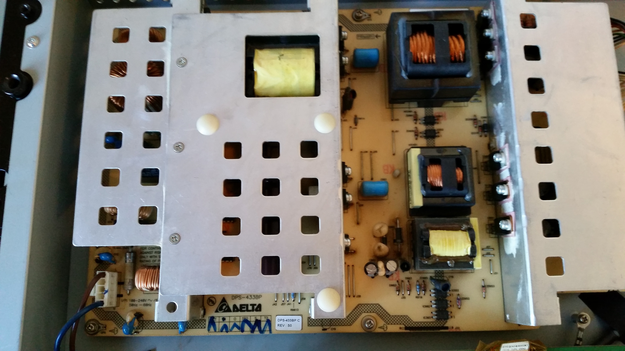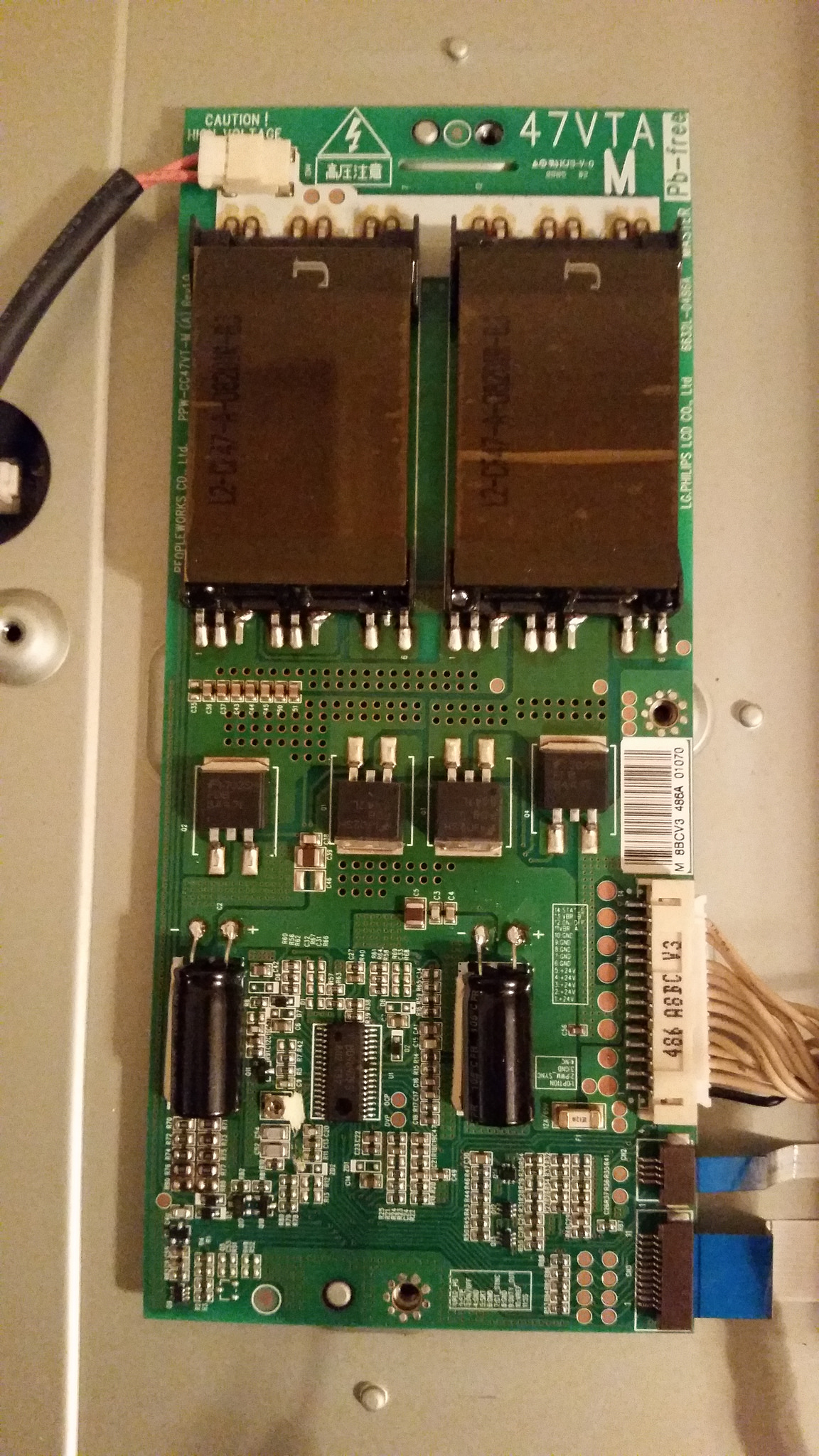 I've got a Vizio vo47lfhdtv10a tv that, when I got it, wouldn't power up. I opened it up and found a bad capacitor on the power supply board and 4 bad caps on the inverter boards. I replaced all of them with low esr caps. One of the pictures shows where the bad cap was on the power supply board, the board was pretty charred, and I re-flowed all of the solder connections in that area.