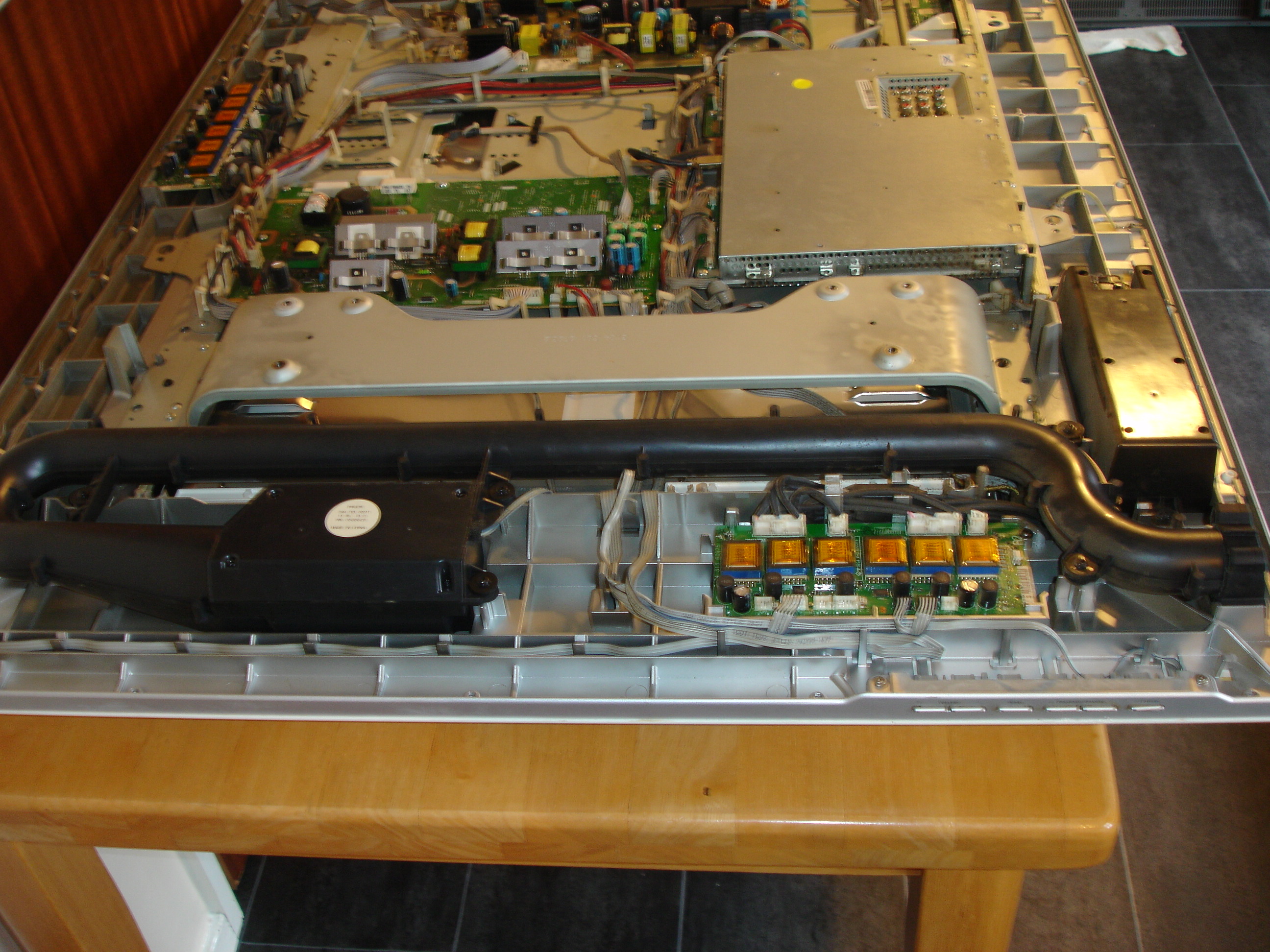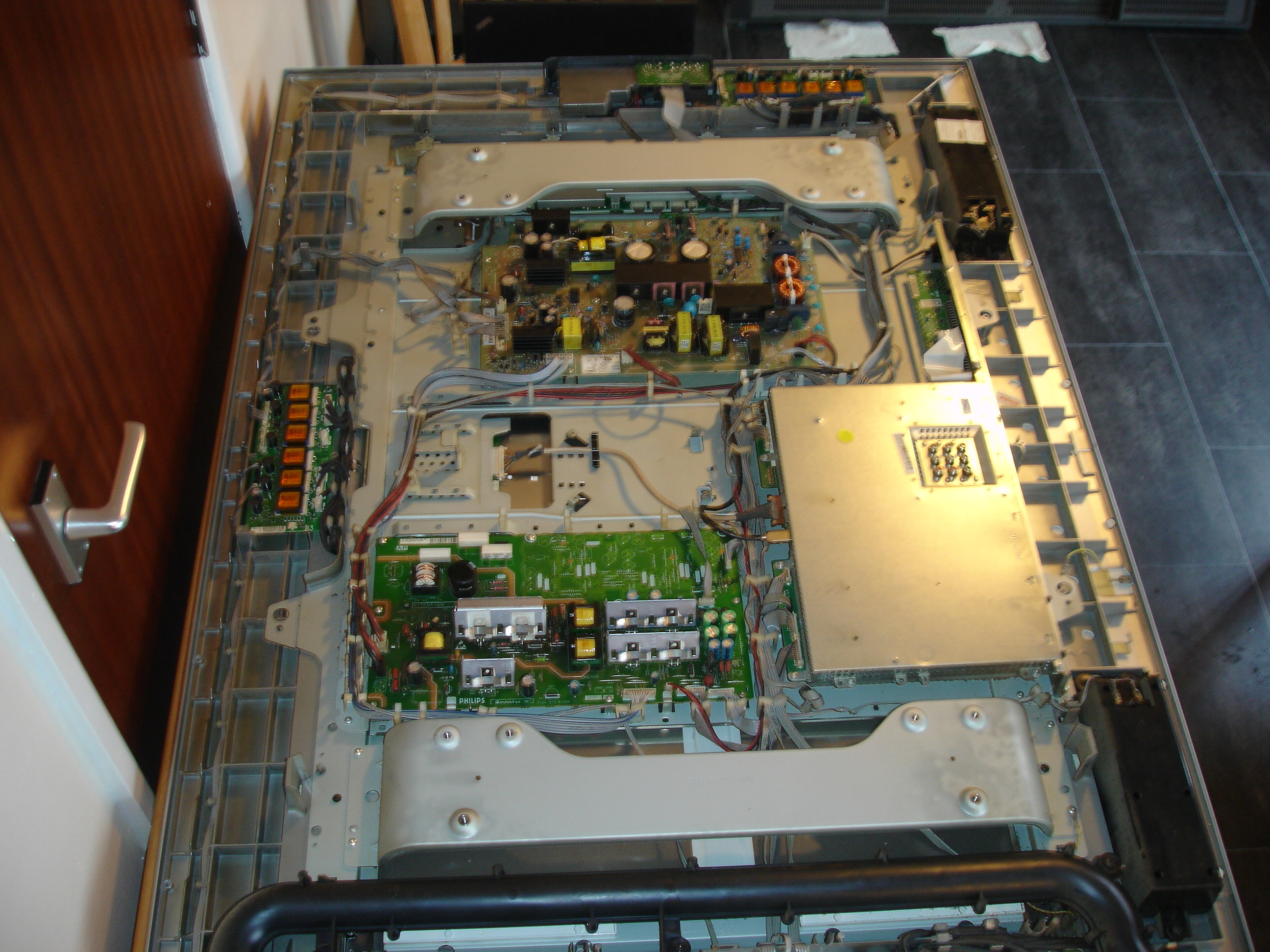 I have this Philips 42pf9831d/10 when tv is turn on working ok but if you turn tv channel over by the side buttons it switch's the tv of and the red light starts flashing and can not turn tv back on ontill you unplug tv and plug it back in and tv will come back on. if you change channels the red light it will flash 1 red light and then delay and flash quick 4 red lights thank that must be a fault code sounds like mainboard no bad caps in the psu.