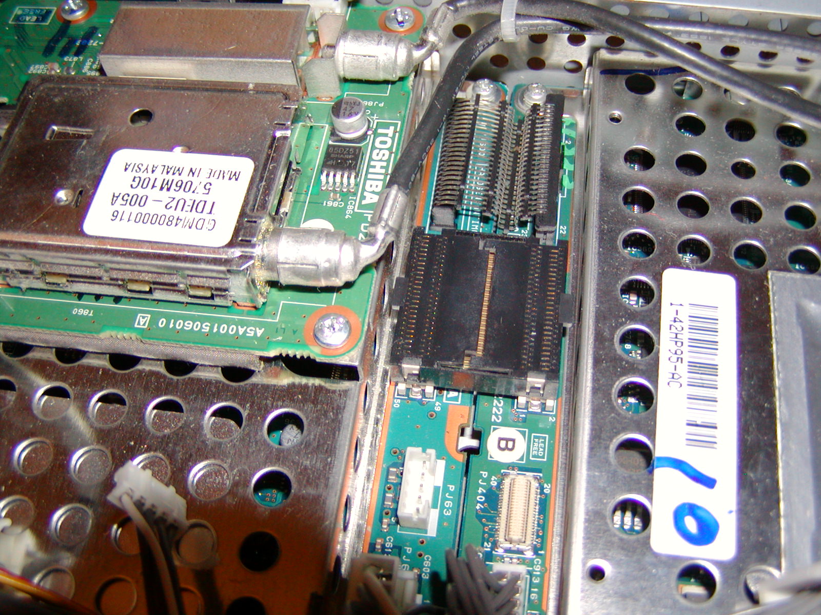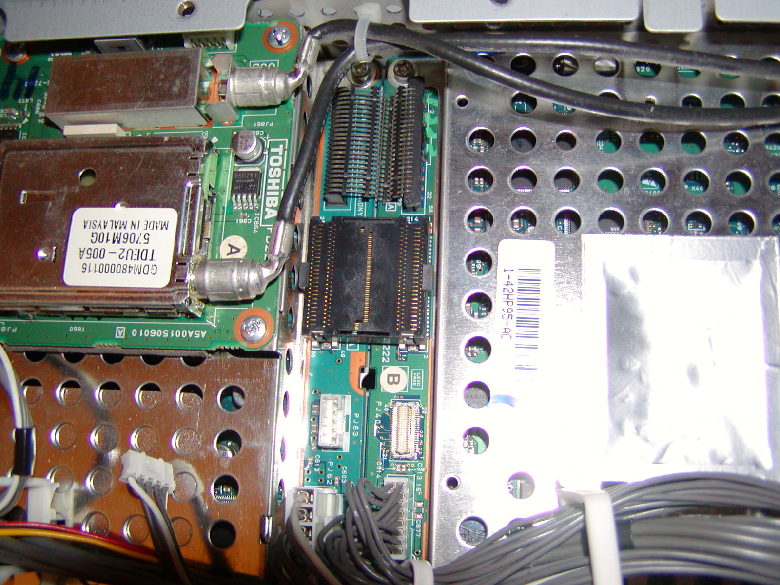 I need help disconnecting the Sein board from the signal board. I took apart a lap top and destroyed the display connector without trying so now I am afraid to mess around with these two Toshiba connectors. I have included two photos. There is a spring type connector at the top and a square black connector below it that I have to remove. Can anybody tell me how to safely remove both of them?