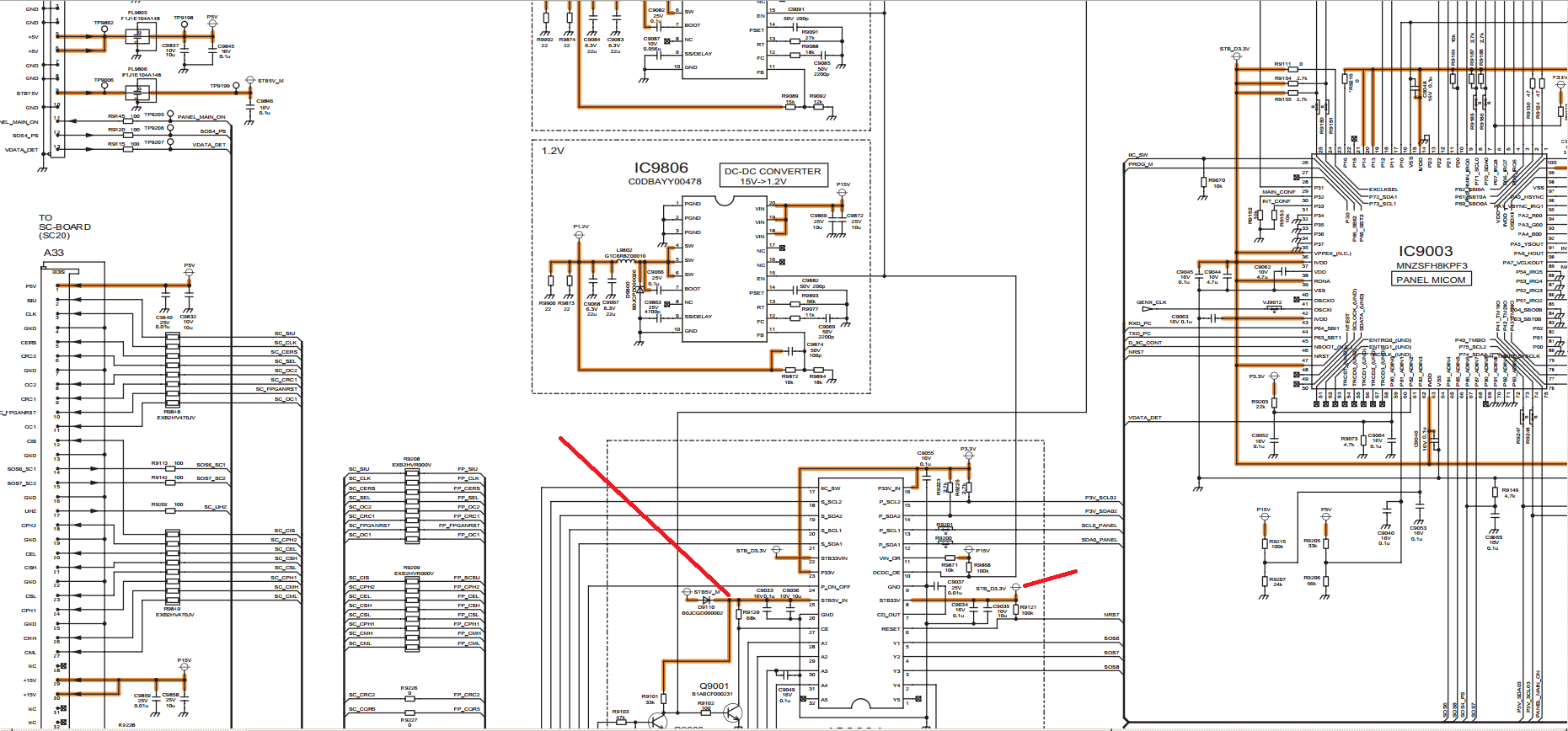 I'd continue on the A-board. The PANEL_MAIN_ON signal for example comes from IC9003. (the other signal going to P7 pin 6 comes from IC1100 on the A-board)
