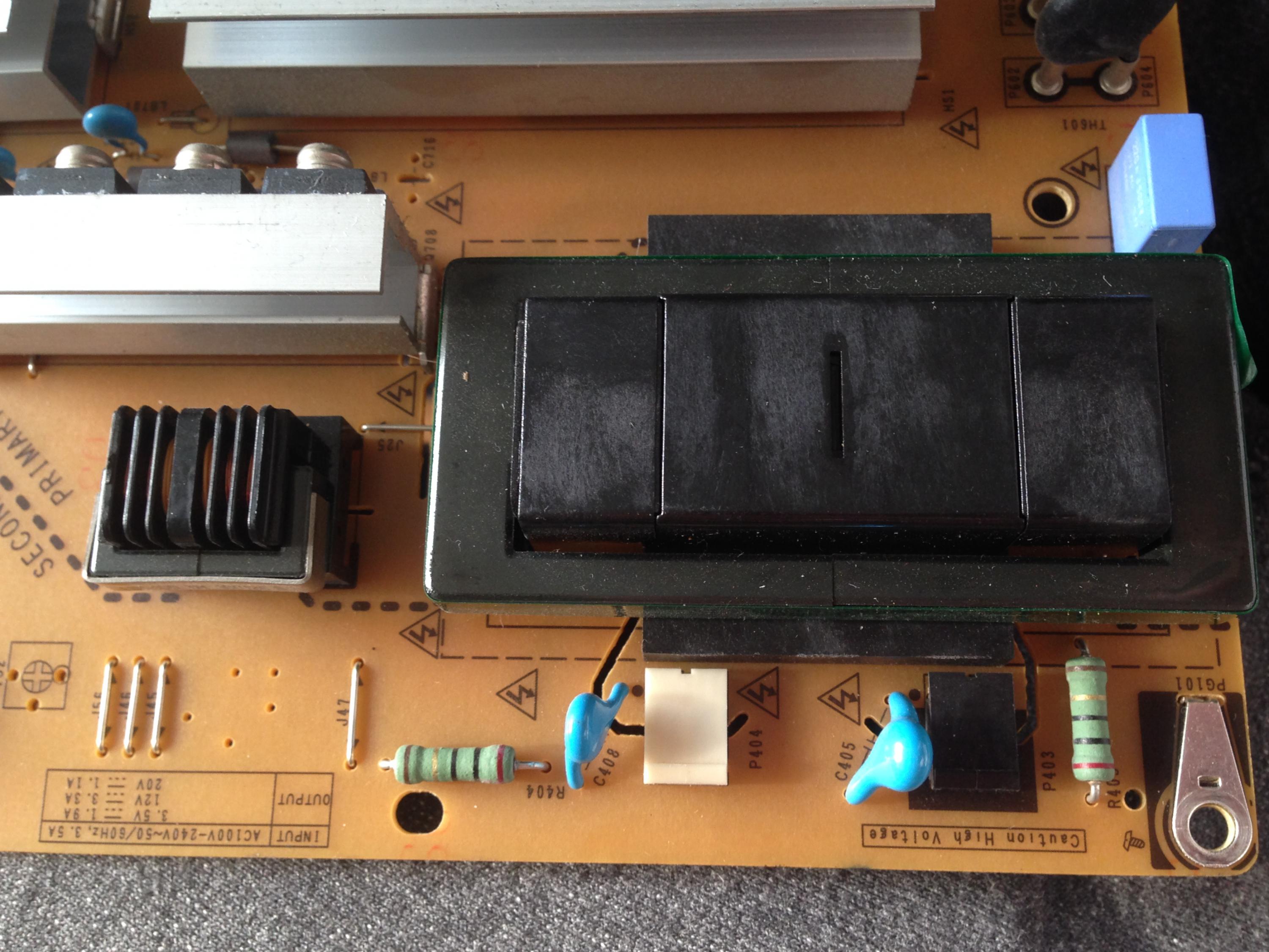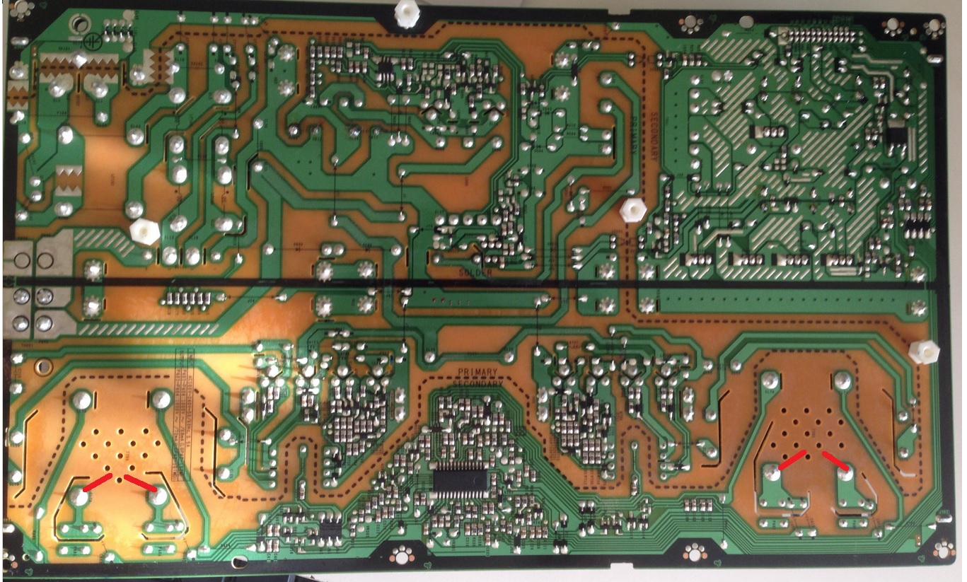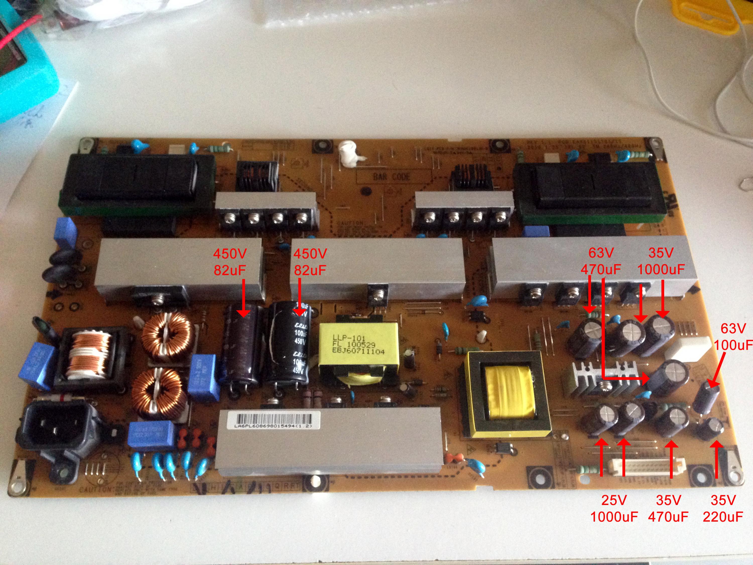 I see there are two main filter caps laying on their sides, one on them is rated at 100uF 450VDC. Are they connected in parallel? I think someone put in the wrong cap (250VDC).