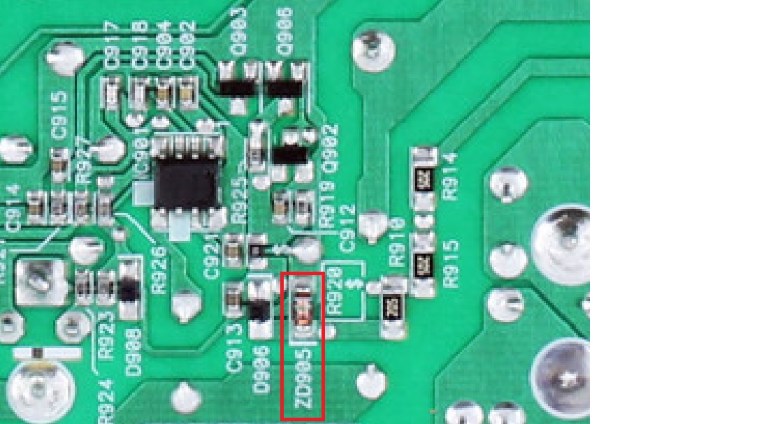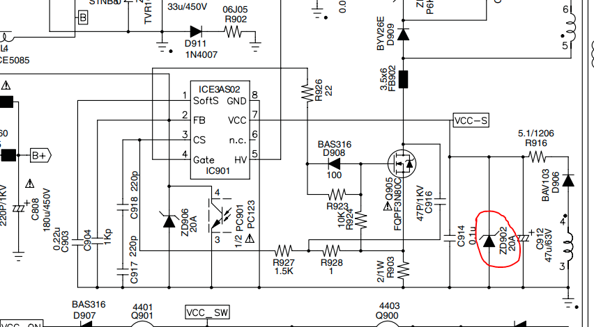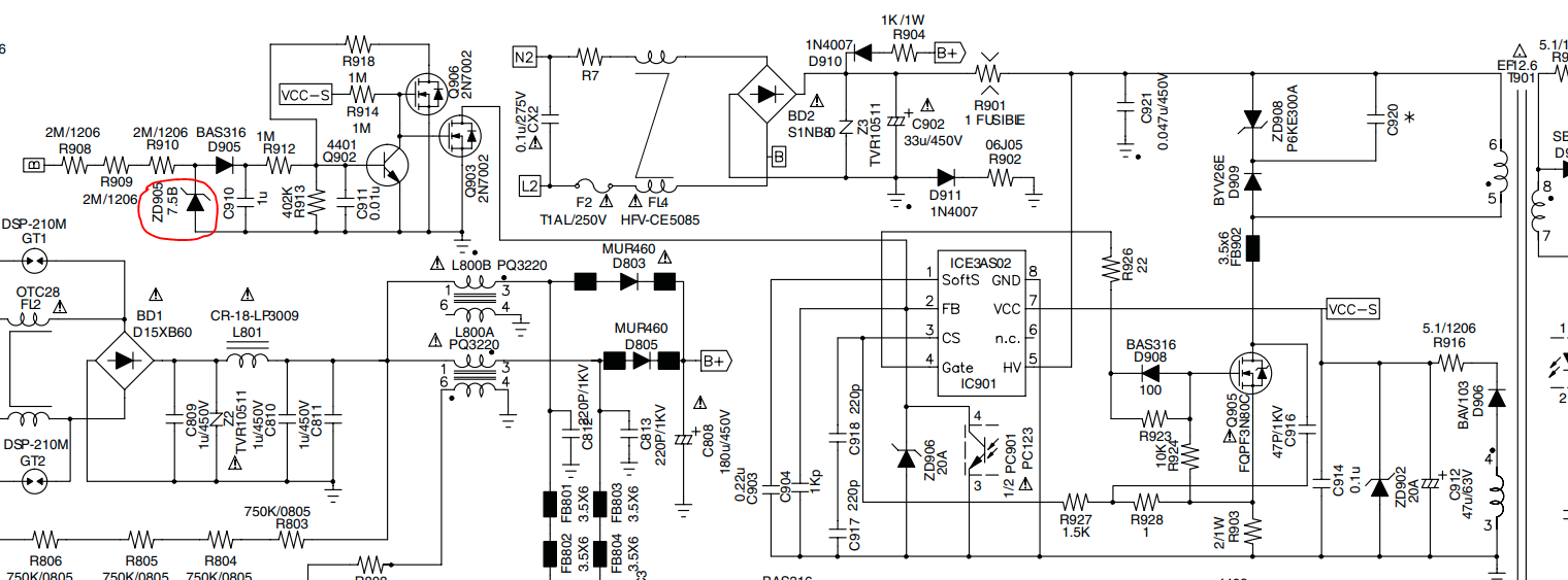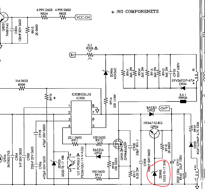 I got a question if anyone knows ? What is the value of ZD905 which is used around the circuitry of IC 3BS03 ? Is it 9.1v or 6.2V. I found a zener at this location which is short circuited. DMM reads short circuit both ways.