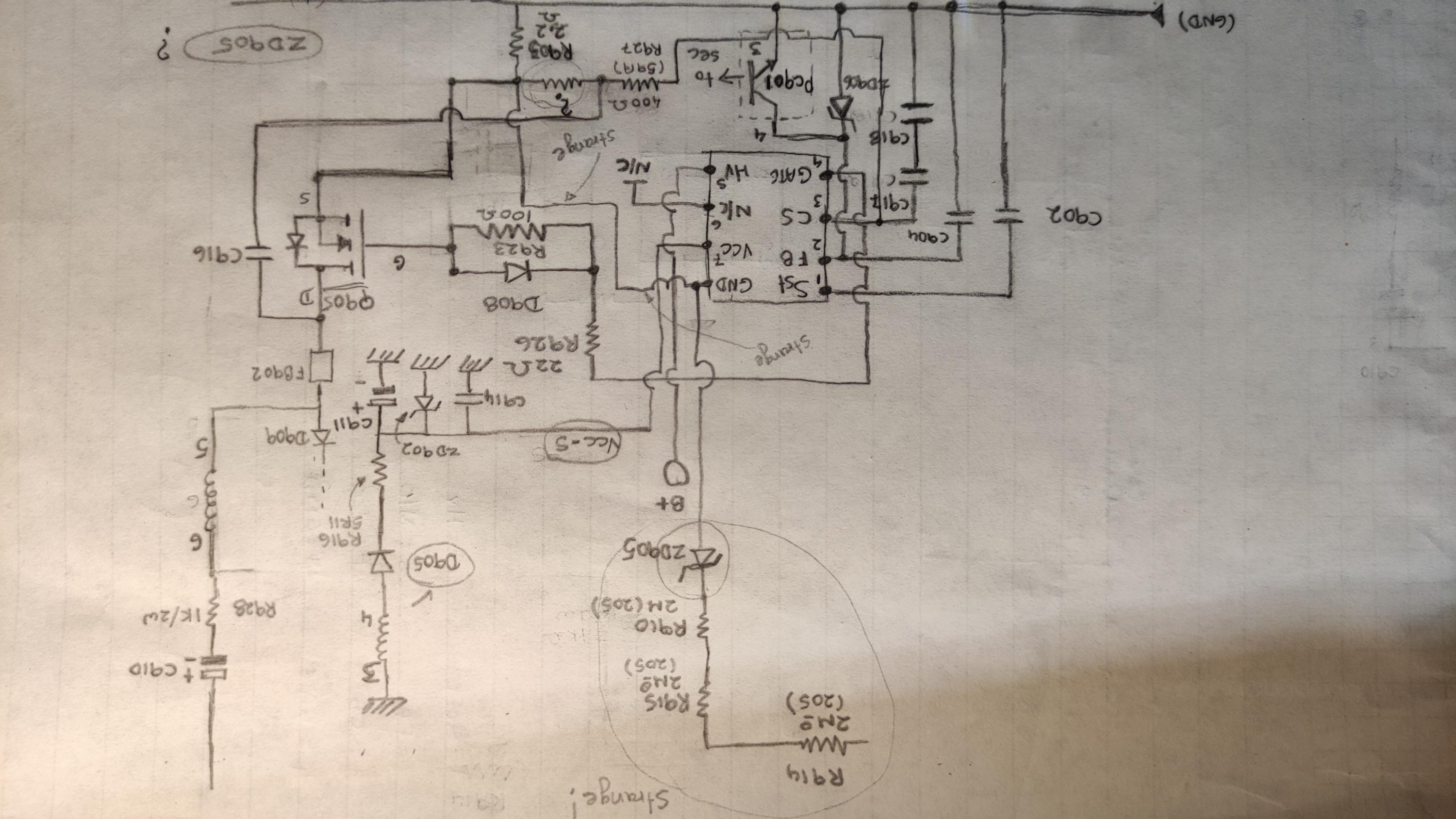 The help of the users Iotas and RJ were great. Basically the circuit is the same with a few differences which I post in my own drawing. Look closely so you can see the differences noted with either a (?) or any other notes I left on the paper. Last 2 posts from Yokoono and nomoresonys stated that ZD is usually 15v and is there to protect the IC901. However if the ZD went bad, then the IC is compromised. So I guess I need to wait until 5/23 when Mouser will be stocking this Chip. For those interested I am located in EU, Cyprus. Sorry you will ned to rotate the attachment