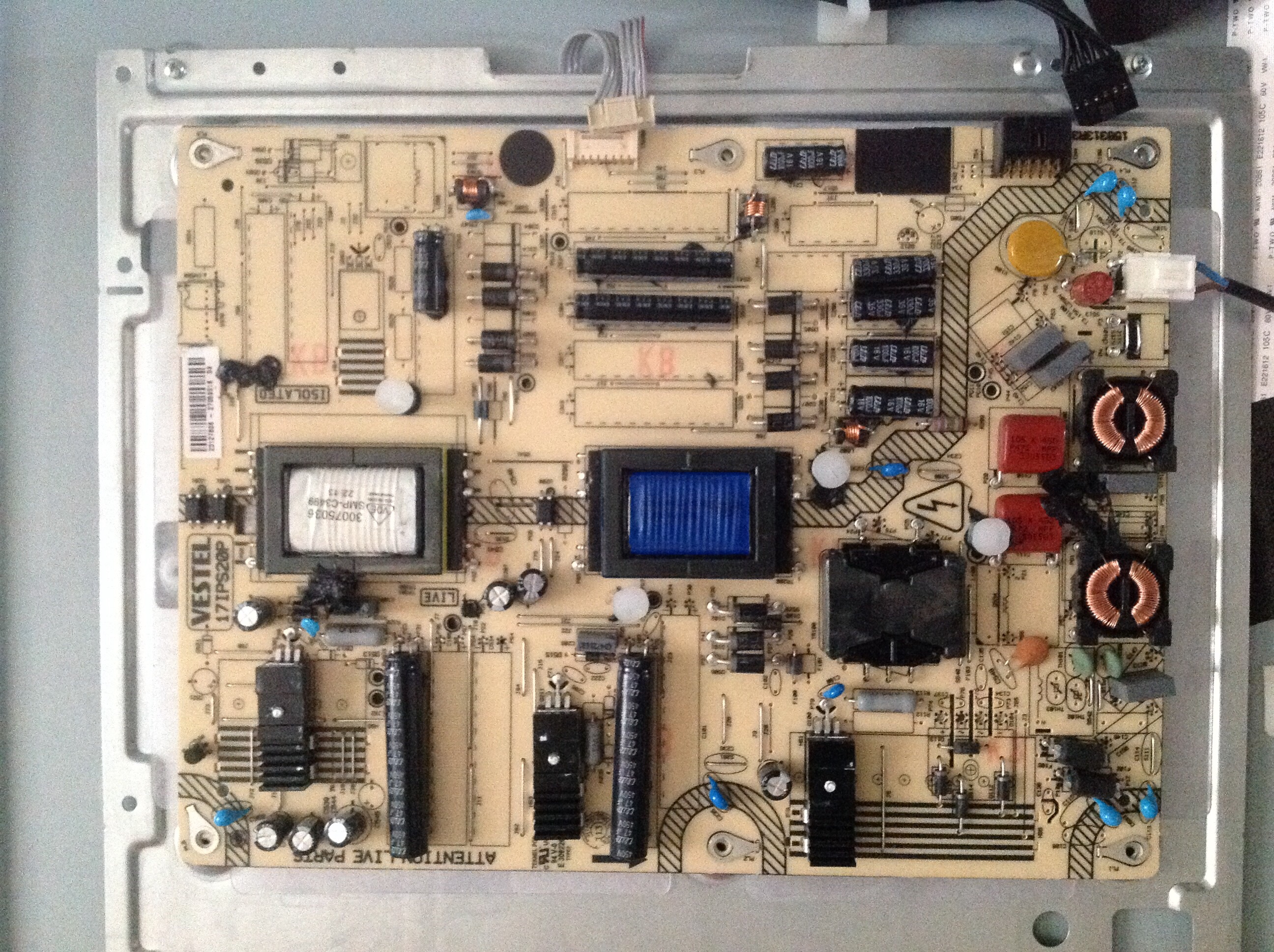 by otousamaI've got this unlucky board, a Vestel 17IPS20P (150313R3) that got a couples surgeries during its lifetime. The last time I fixed it there was a blown diode (D208), nothing extraordinary, happened already two years ago, changed it and everything was fine. Then after about a month I had the brilliant idea to add the unpopulated diodes D207 and D505 to harden this weak spot. During this operation I must have splattered some solder on the HV section cos after closing the lid and giving power a loud boom happened.