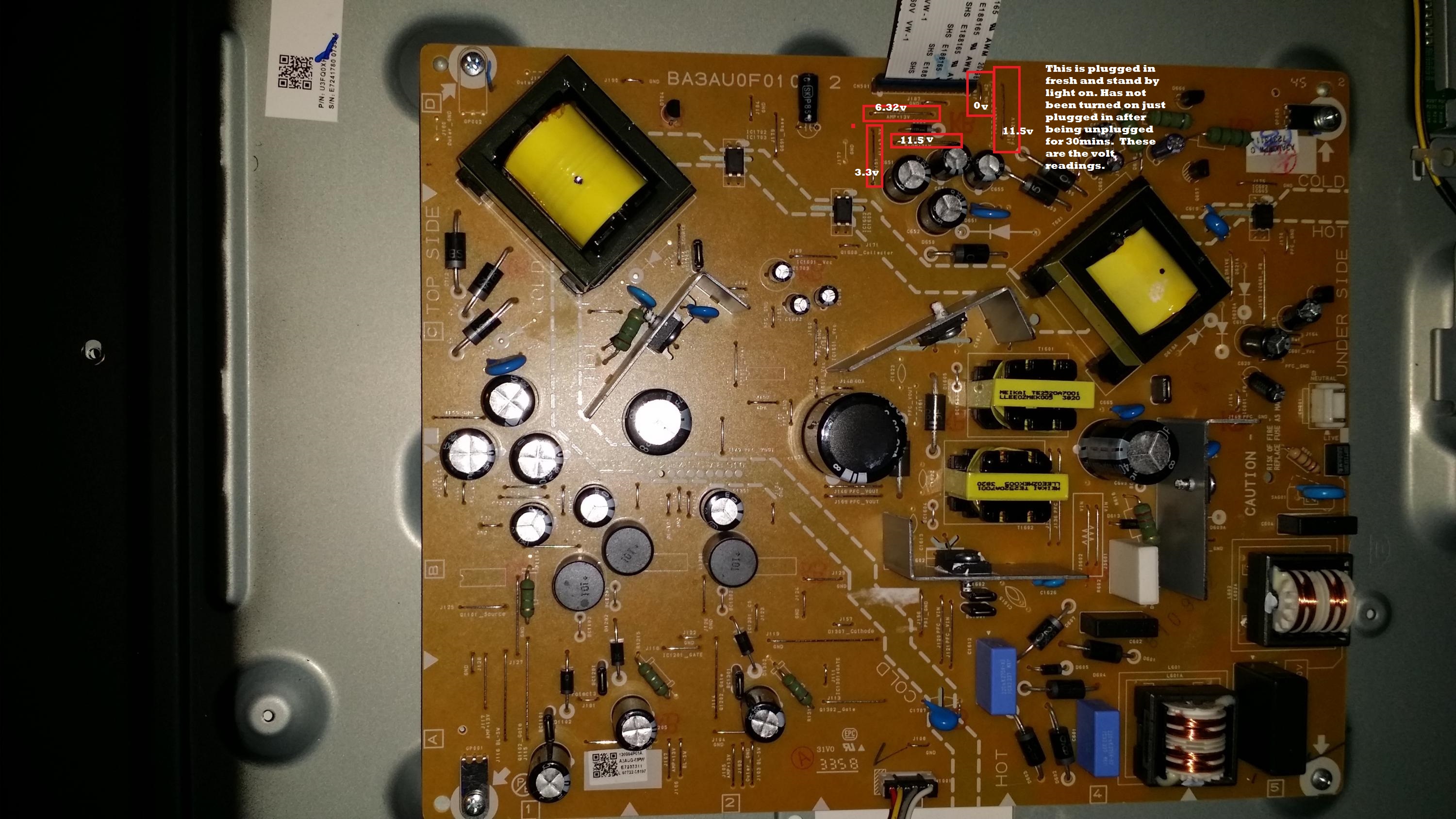 I need some help.I am a Newbie to this forum but I have been repairing tvs as a hobbie for about the last year. I bought a tv that is only 14 months old that if you plug it in will work perfectly and turn off perfectly but then will not turn back on unless you unplug it for 30mins.I also do not know how to check the power board because it does not have pins that are marked with correct voltage as everyone i HAVE REPAIRED BEFORE.It has a ribbon from power board to mainboard with no markings as I have seen before. Please help guide me in how to determine how to check tv for bad part. thank you all in advance.