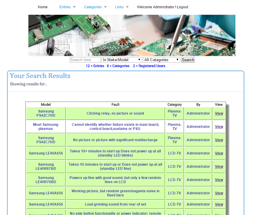 You can search the database by Make/Model , category , fault description , or diagnosis / fix .