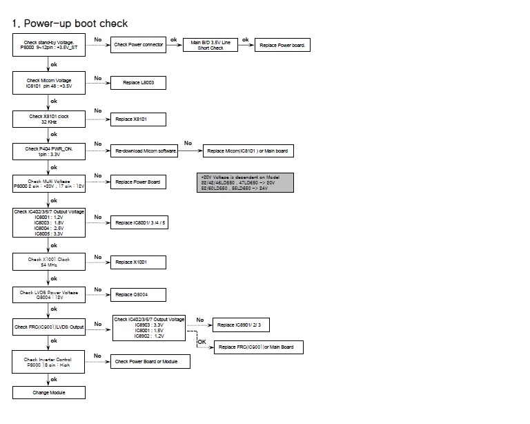 I downloaded the service manual and went down the testing checklist for the main board and everything tests good up to the X1001 crystal...as my frequency tester only goes to 10MHz Im not sure how to test it. The next item q8004 has 12v leaving, the lvds output I have not tested but the tcon is not receiving any voltage and the inverter control pin is still low .455v